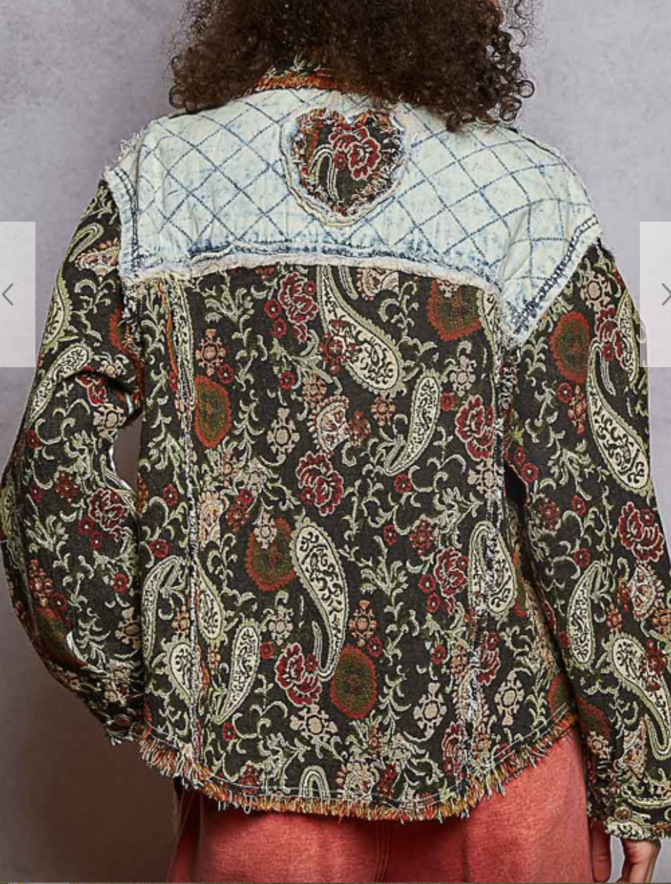 Designed in balloon sleeve relaxed fit shaket top in jacquard with denim quilting patch, outseam, front pocket with shirring, raw edge, back heart patch, vintage washing, floral pattern.