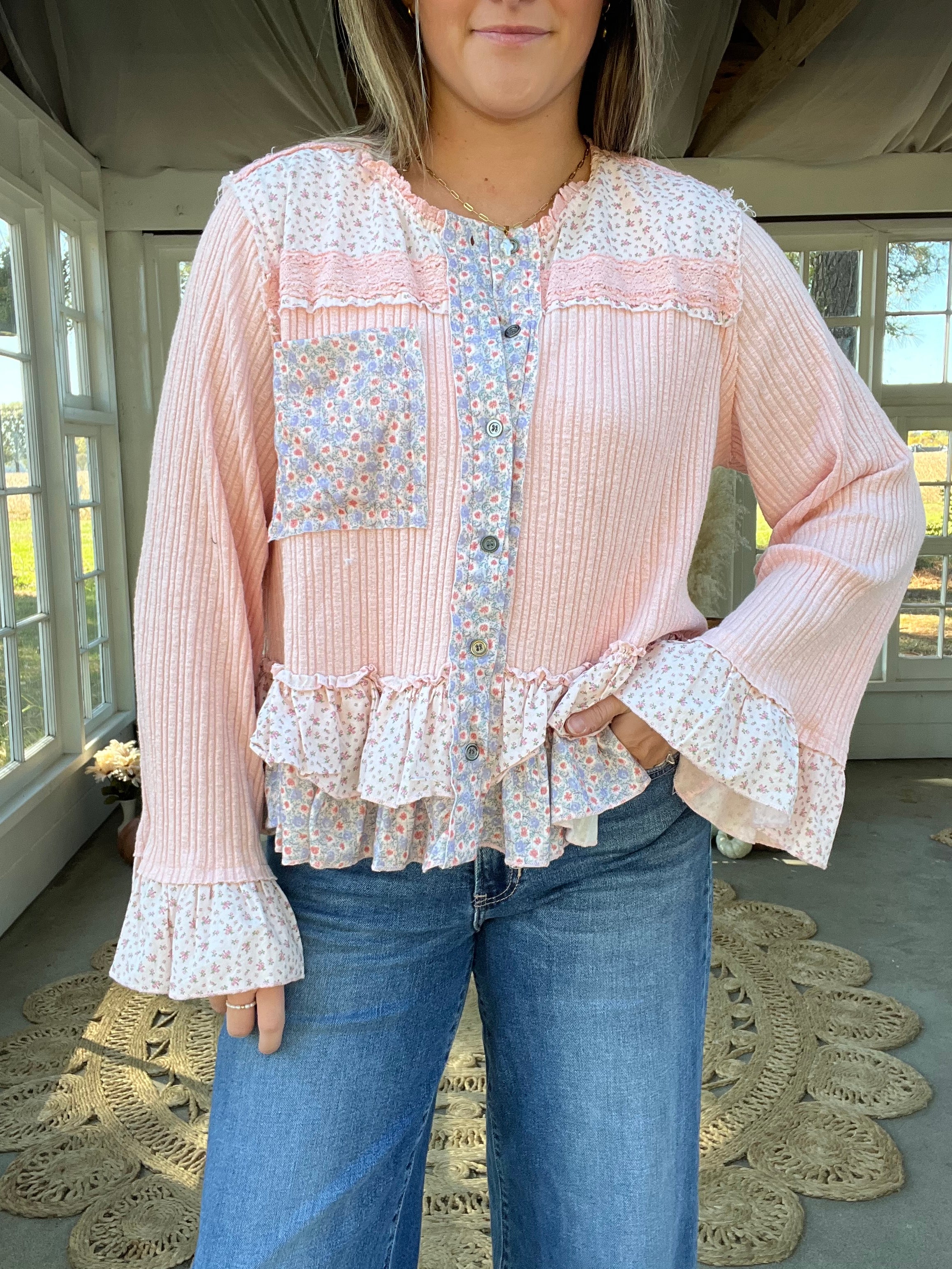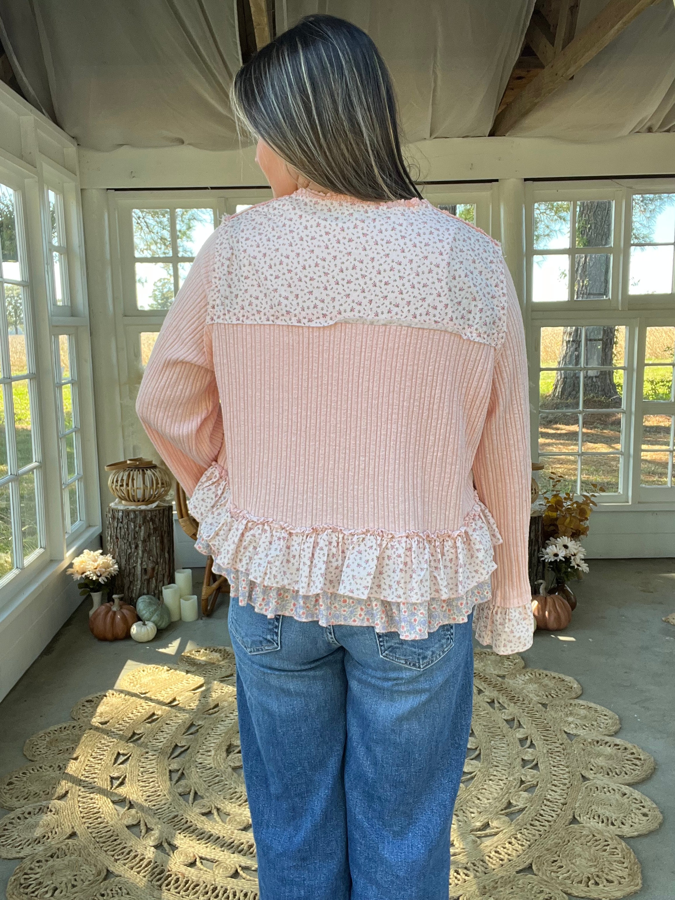 Designed in round neck, long sleeve, ruffle hem, relaxed fit top in rib with floral print.