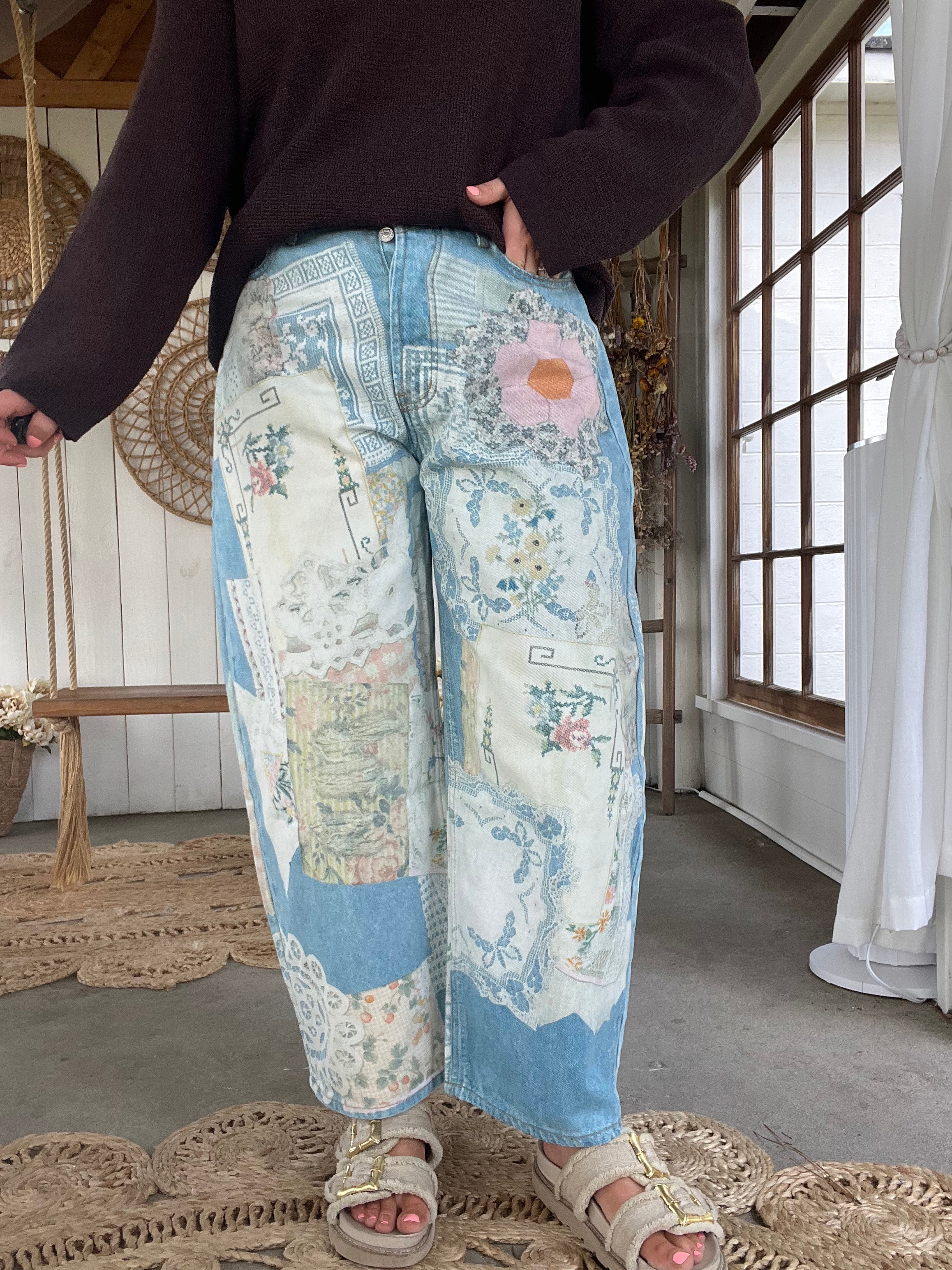 High-rise denim jeans with a relaxed barrel leg silhouette, featuring an allover vintage-inspired patch print with florals, lace, and needlework motifs. Classic five-pocket styling with a button fly and belt loops.