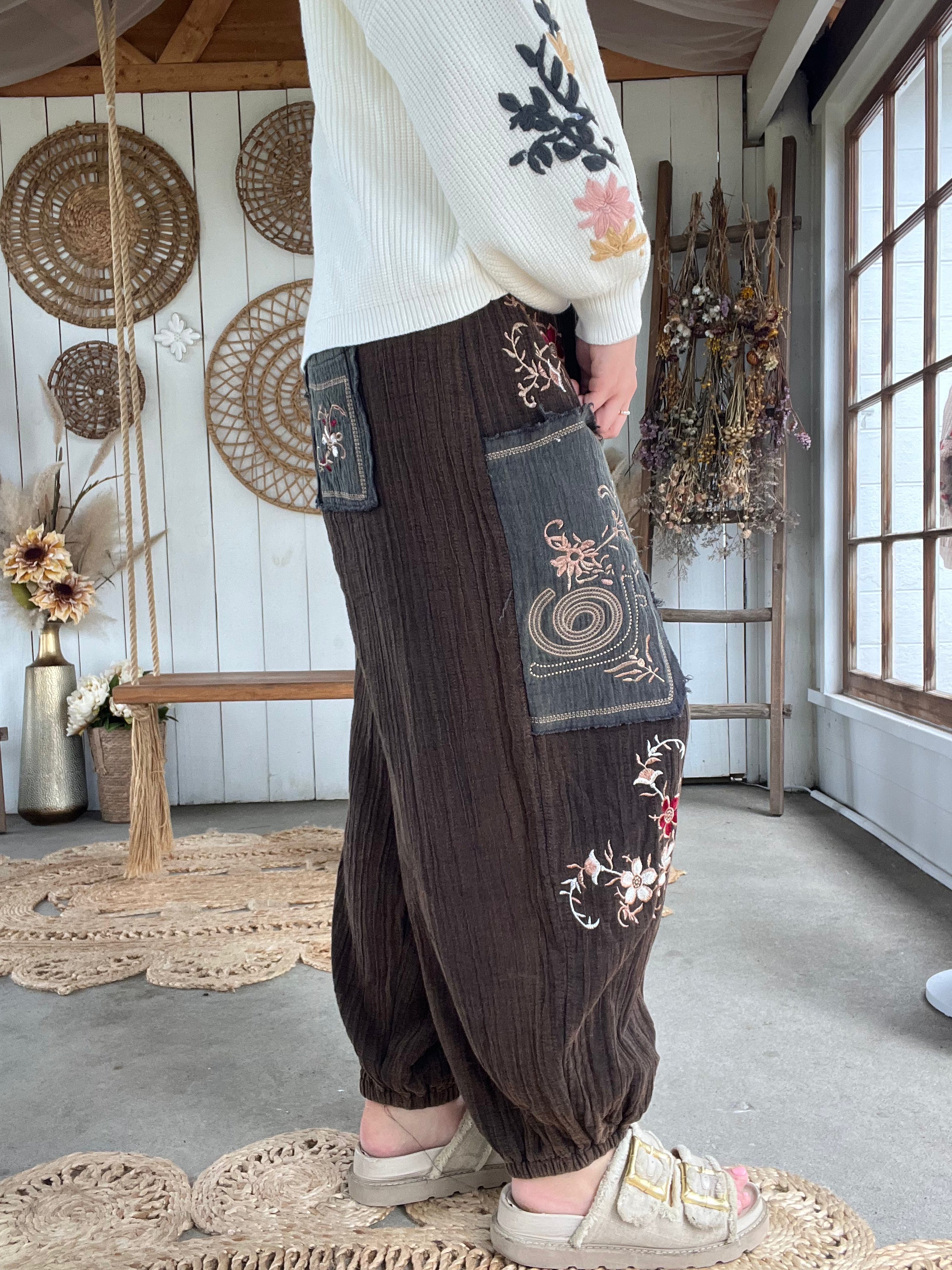 Designed in roomy fit bottom in double gauze with patch detailing, floral embroidery accents, and varied pockets.