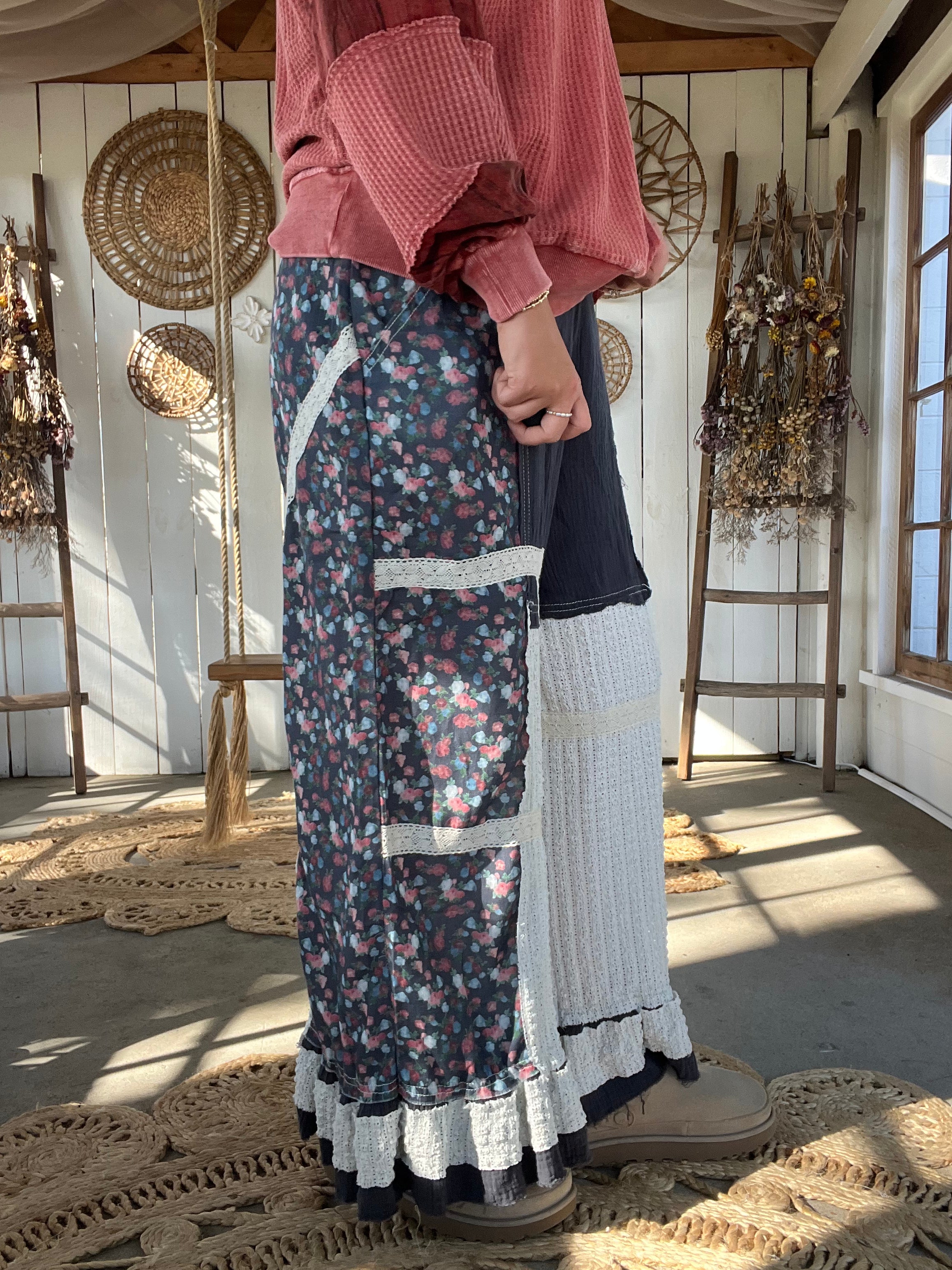 Designed in wide pants in double gauze with lace patch, print patch, trim point, ruffled leg opening, normal washing, solid color.