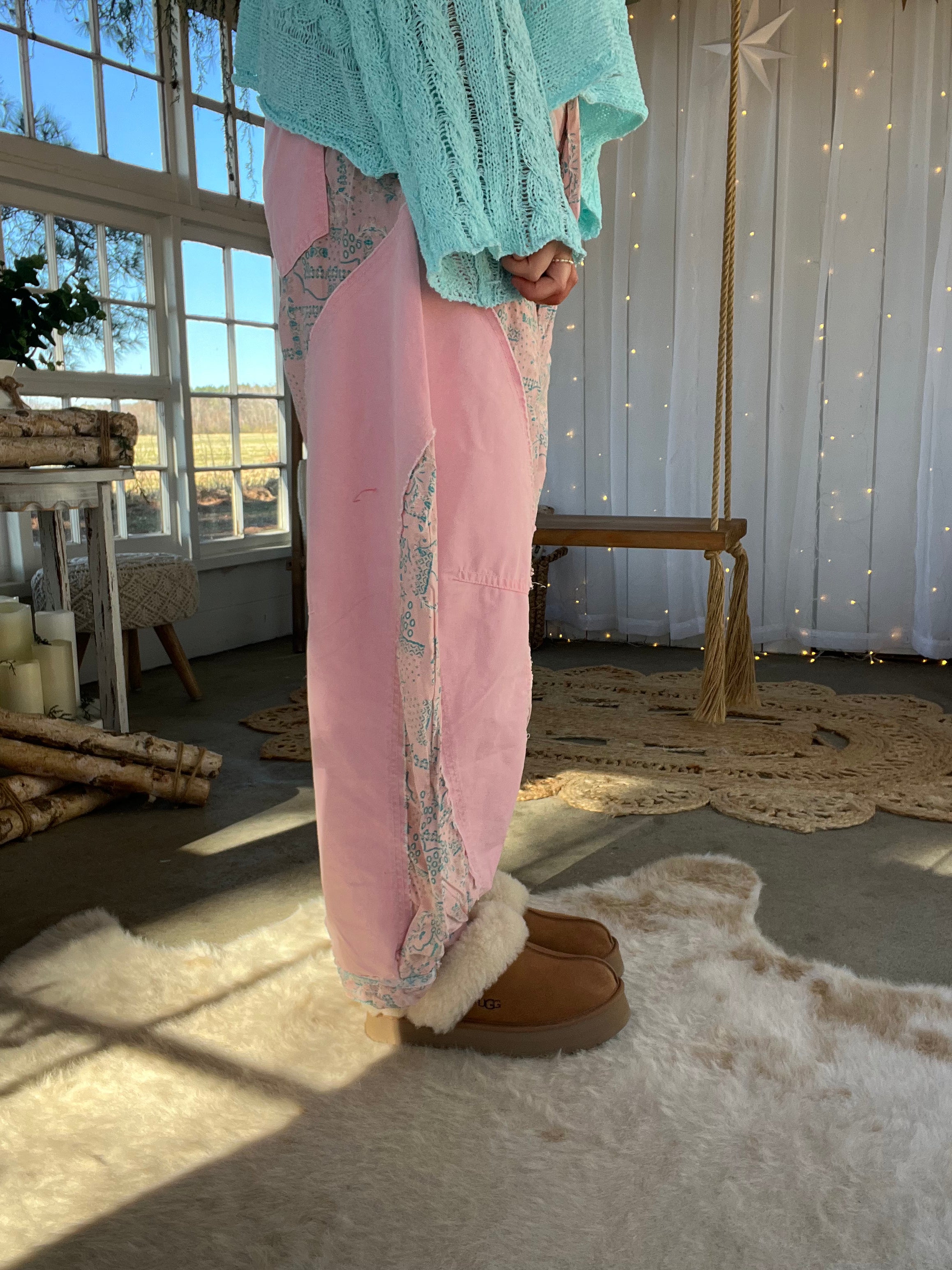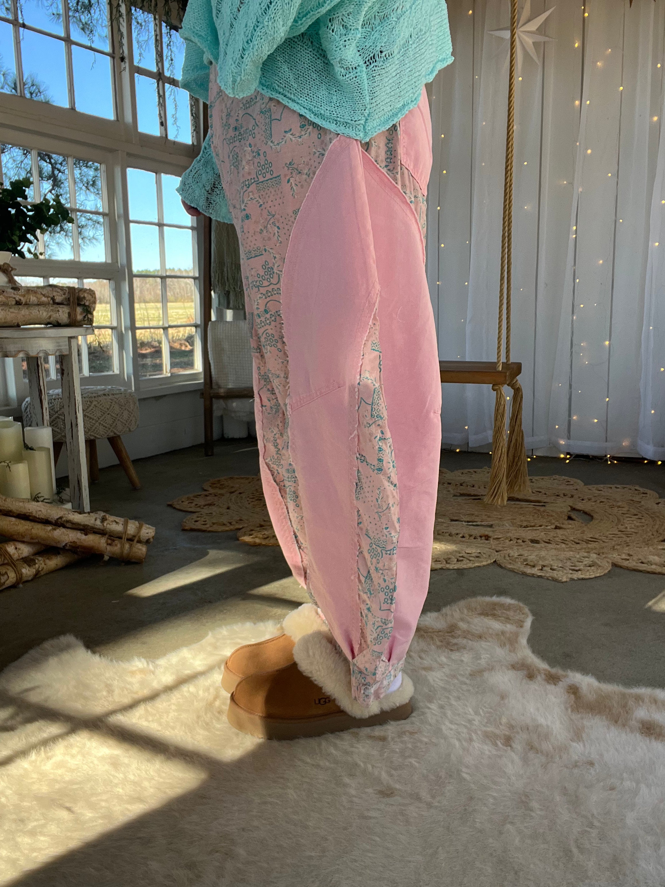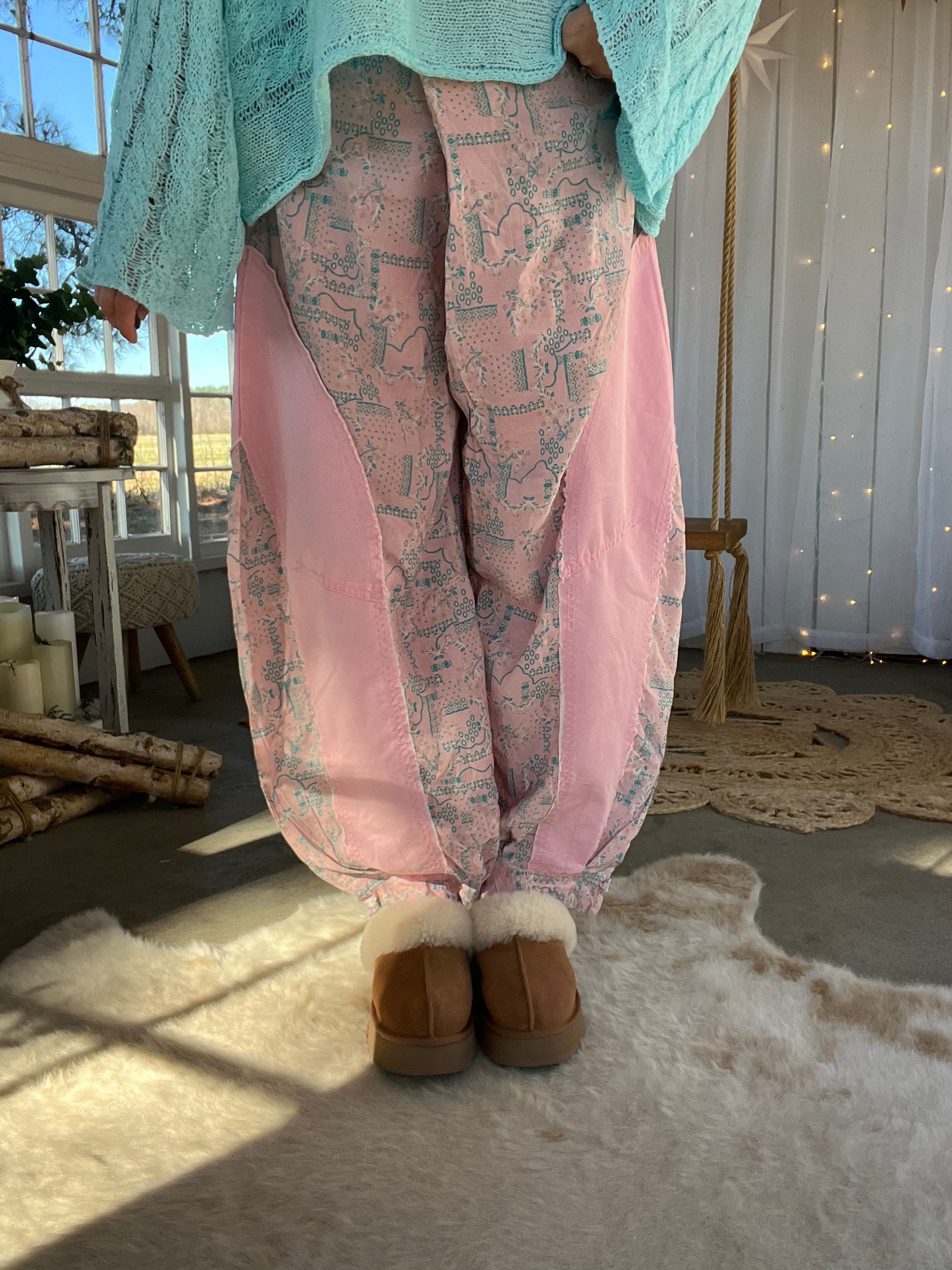 Designed in barrel fit pants in printed woven with big contrast panel on side and waist button detail.