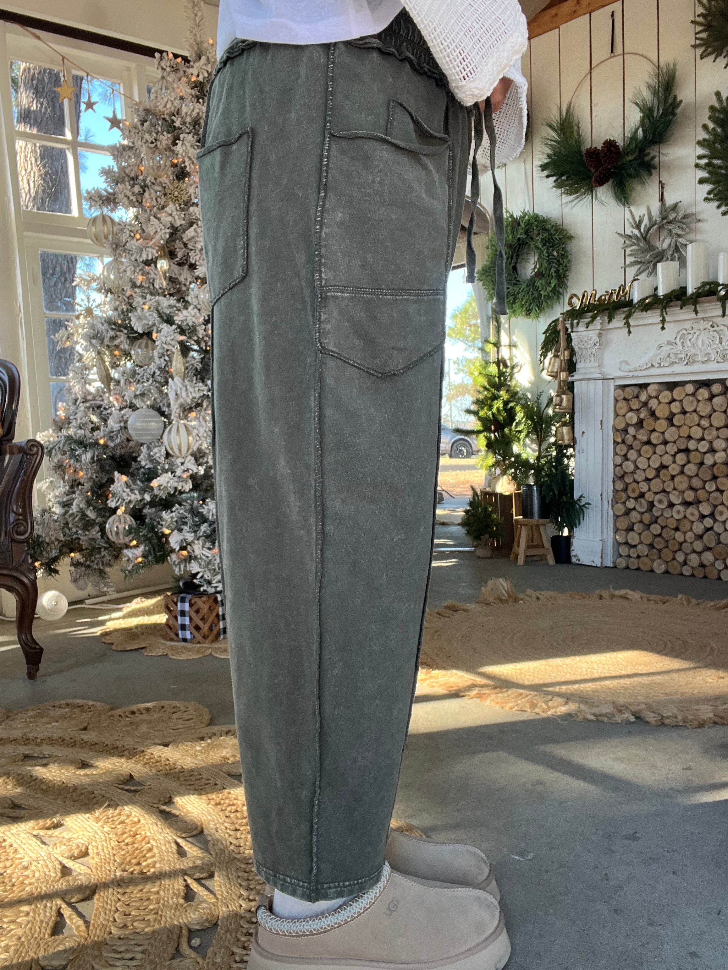 Cienna Mineral Washed Terry Knit Barrel Pants bring comfort and style together with their loose fit and relaxed silhouette. Featuring an elastic waistband with a drawstring, these pants offer an adjustable, cozy fit perfect for any casual day. Large patch pockets on the front and back add a fun, functional touch to your outfit. Slip into these playful pants and enjoy effortless comfort all day long!