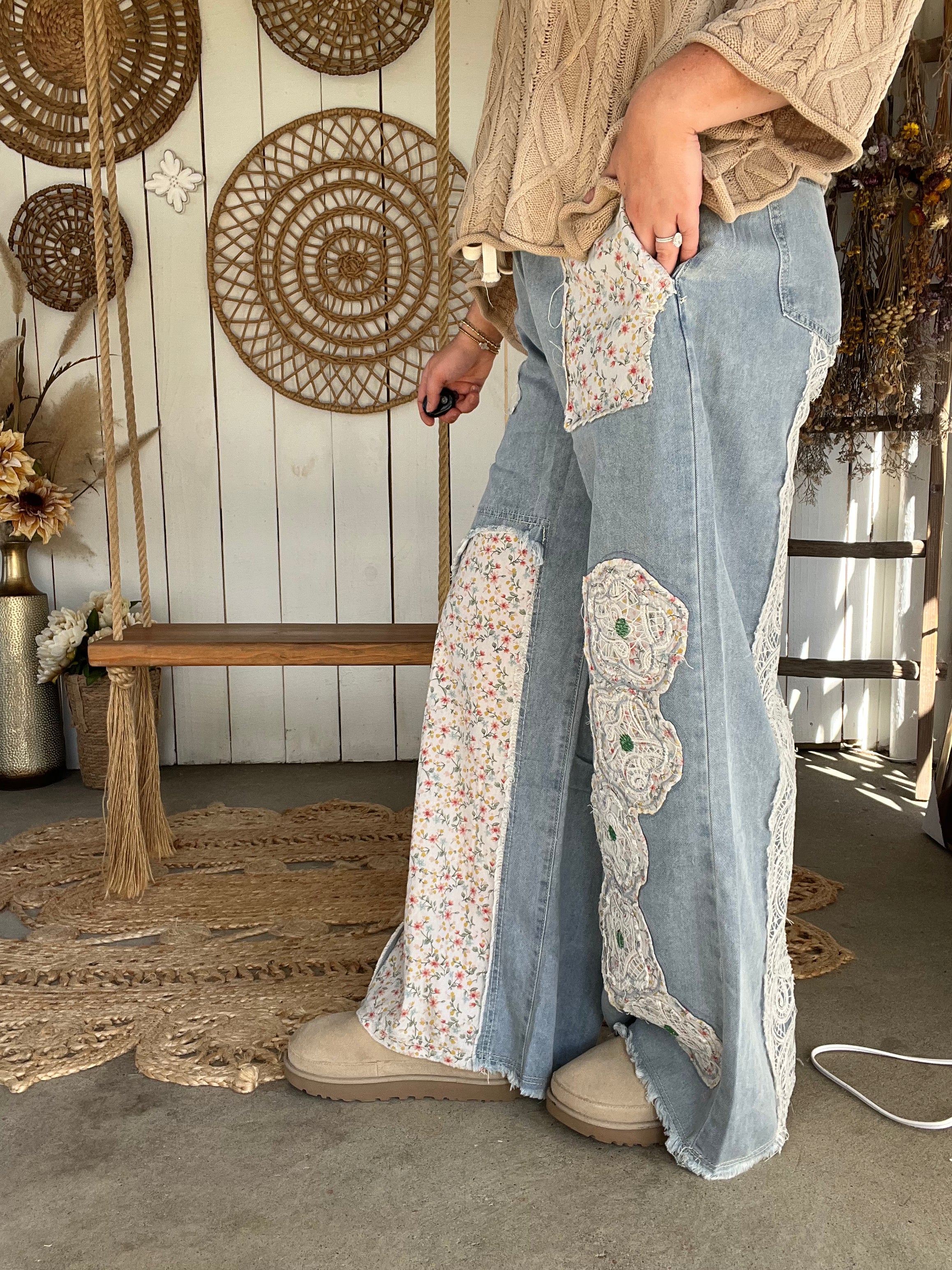 Designed in relaxed fit pants in denim with floral patch detail.