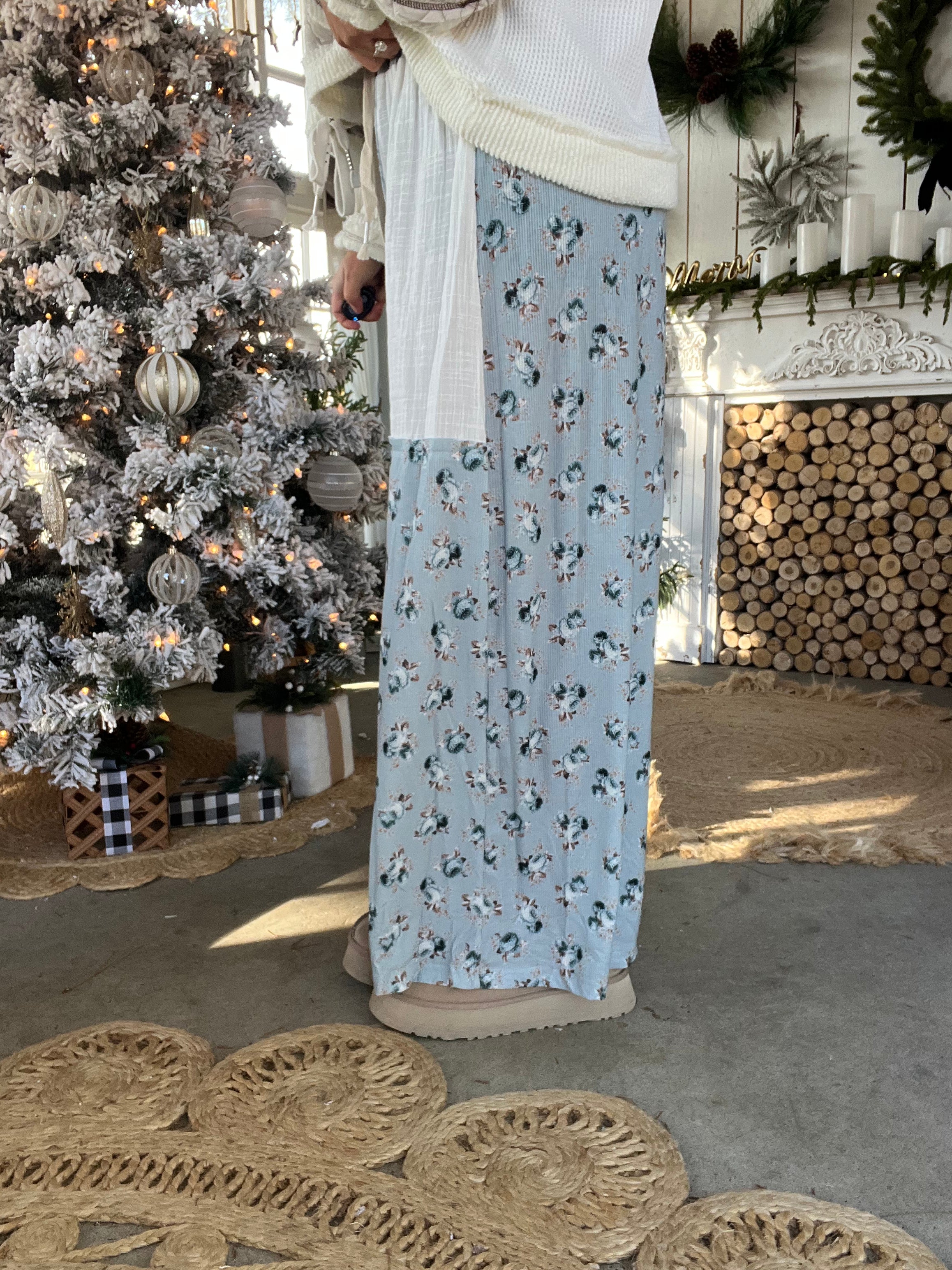 Designed in wide pants in printed rib with linen patch, outseam, normal washing, floral pattern.