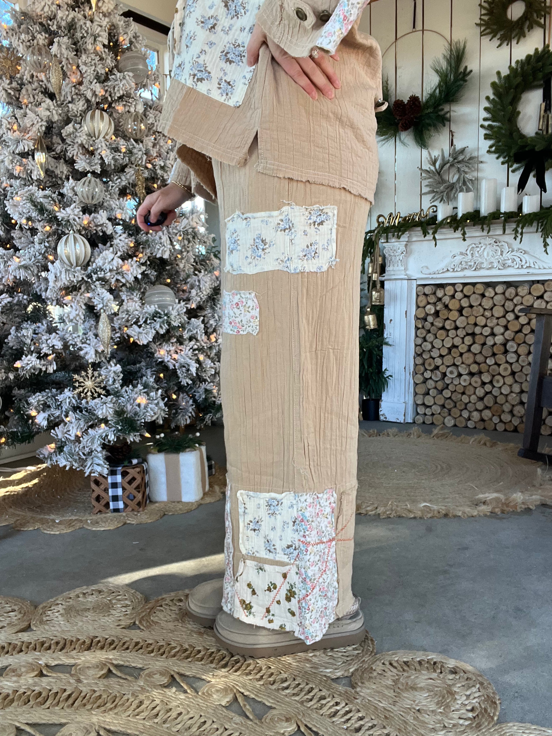 Designed in wide pants in stitched double gauze with print patch, embroidery point, waist loop, vintage washing, solid color.