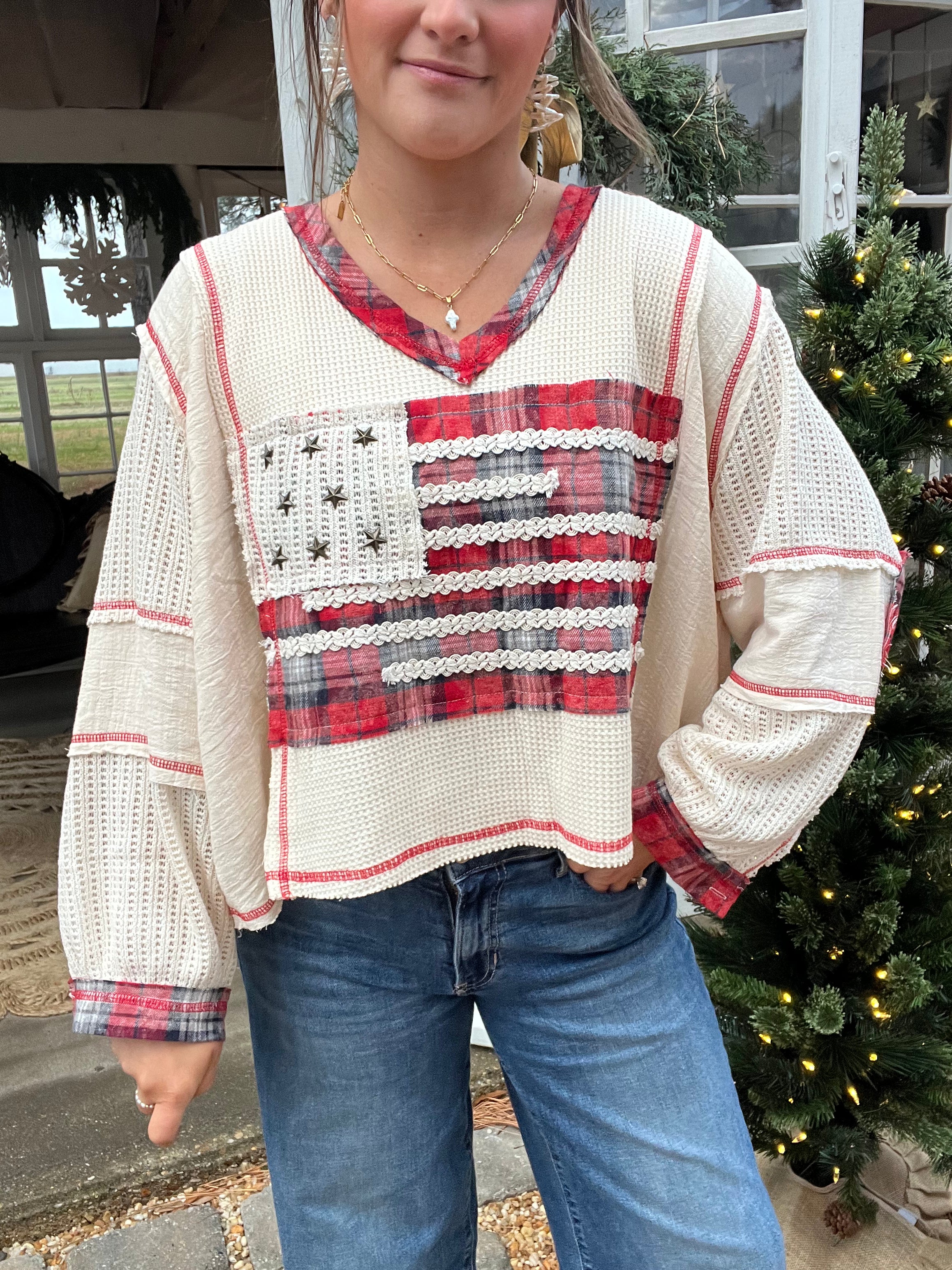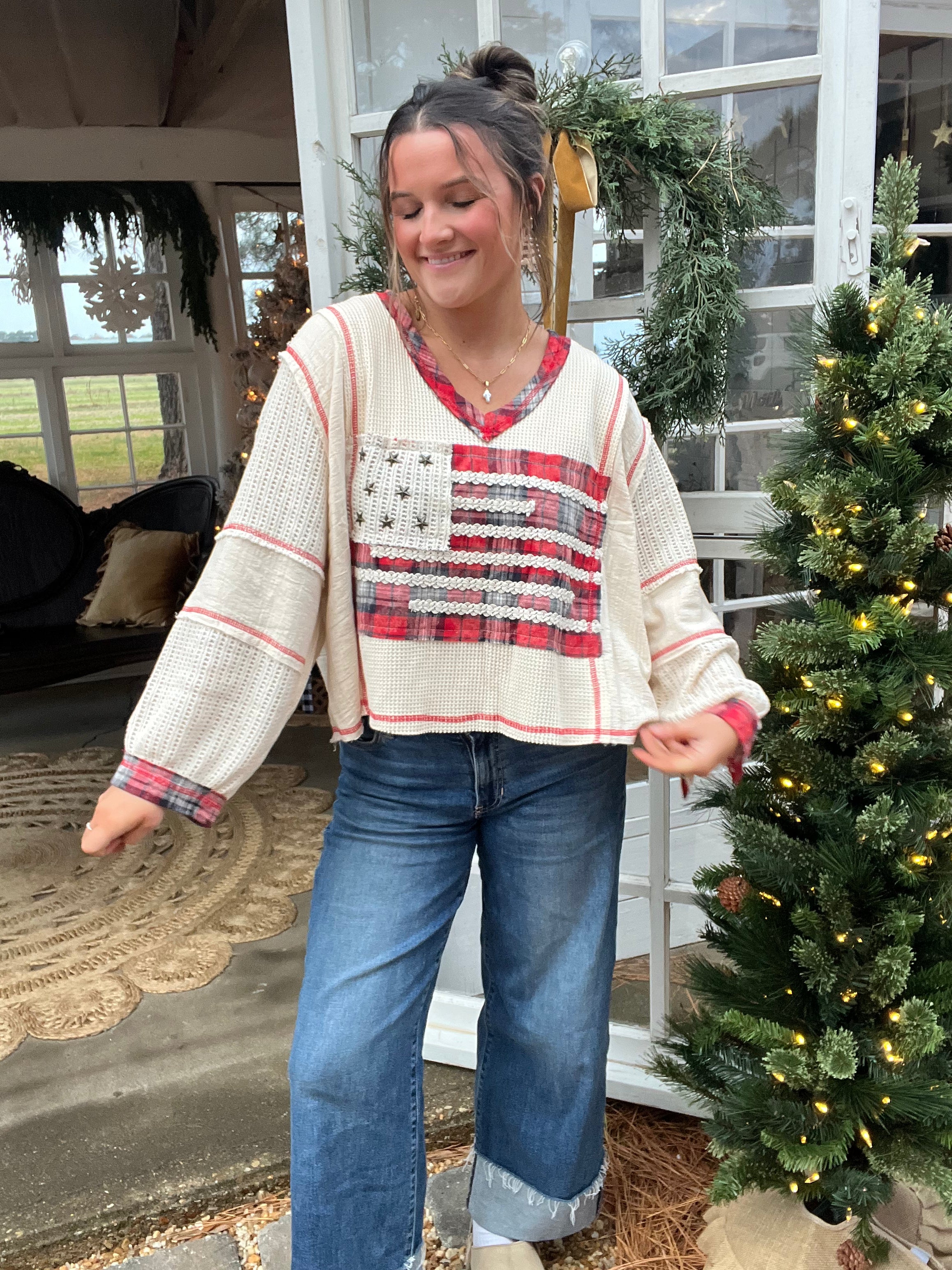 This playful American Flag Thermal Shirt in vibrant red features a cozy oversized fit with a flattering V-neck and trendy balloon sleeves. Crafted from soft thermal fabric, it’s detailed with stud accents and a pointed plaid trim that adds a fun twist to classic style. Perfect for layering or wearing solo, this top brings comfort and charm to your casual wardrobe.