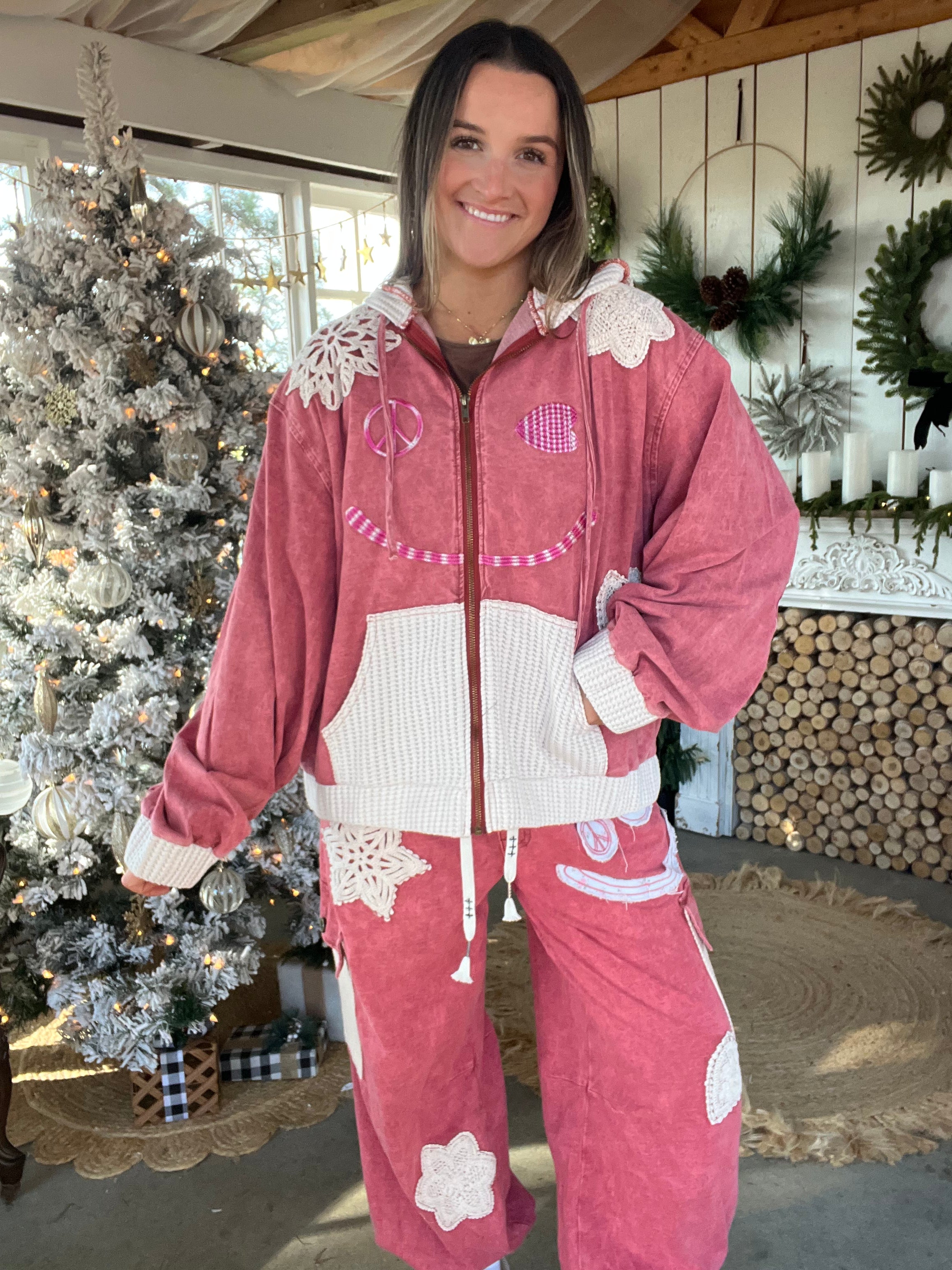 Designed in hooded long sleeve oversized fit zip-up jacket in French terry with crochet trim and love & peace smile.