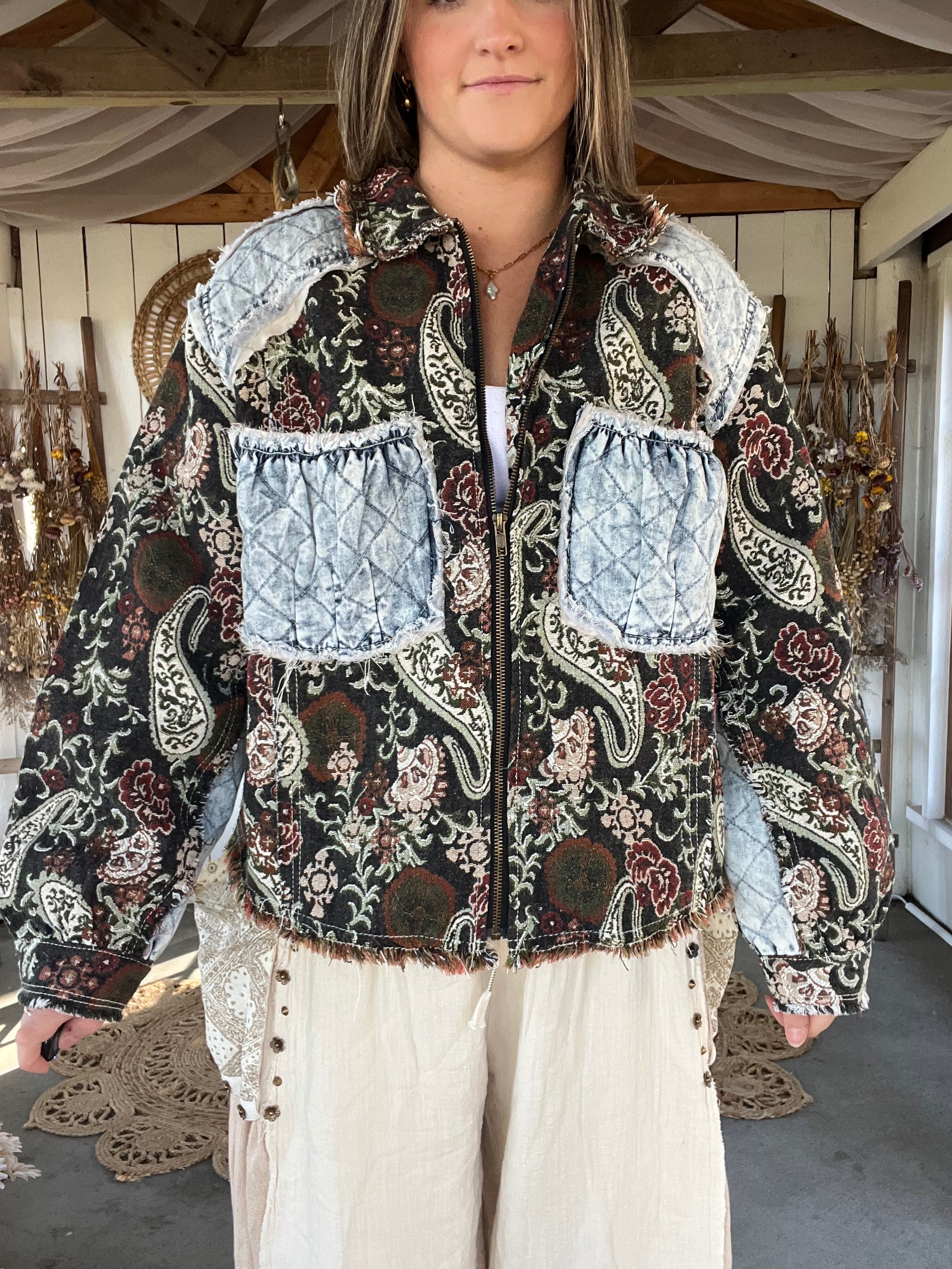 Designed in balloon sleeve relaxed fit shaket top in jacquard with denim quilting patch, outseam, front pocket with shirring, raw edge, back heart patch, vintage washing, floral pattern.