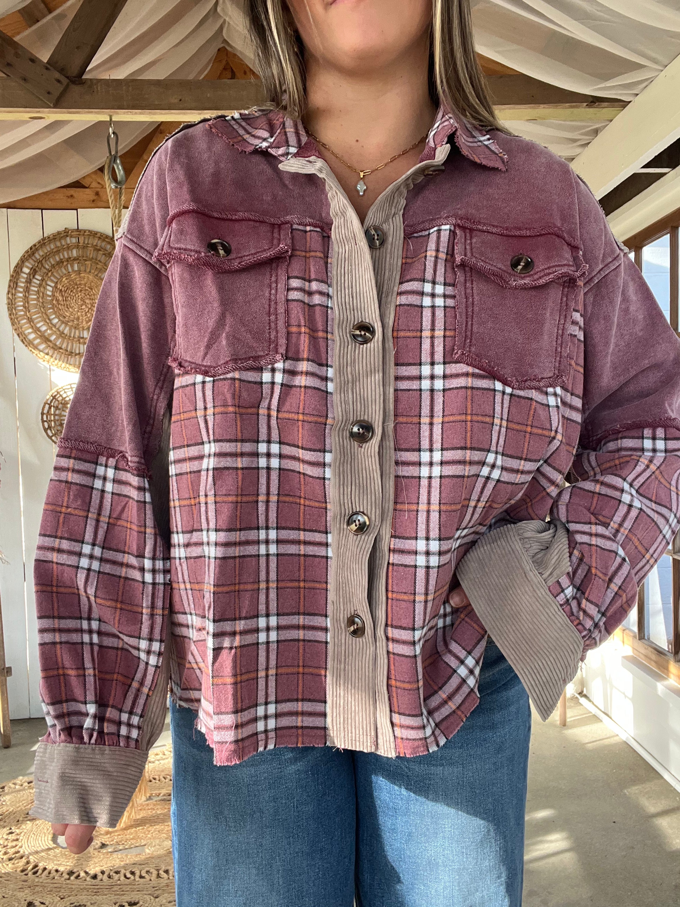 FLANNEL PLAID MIX CORDUROY BUTTON DOWN SHACKET