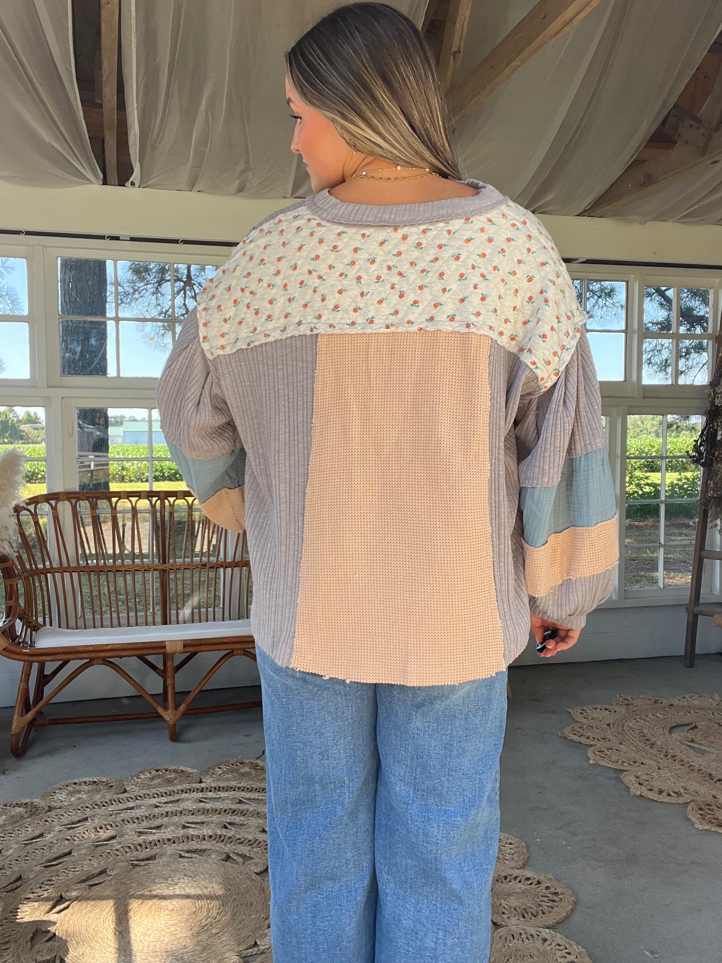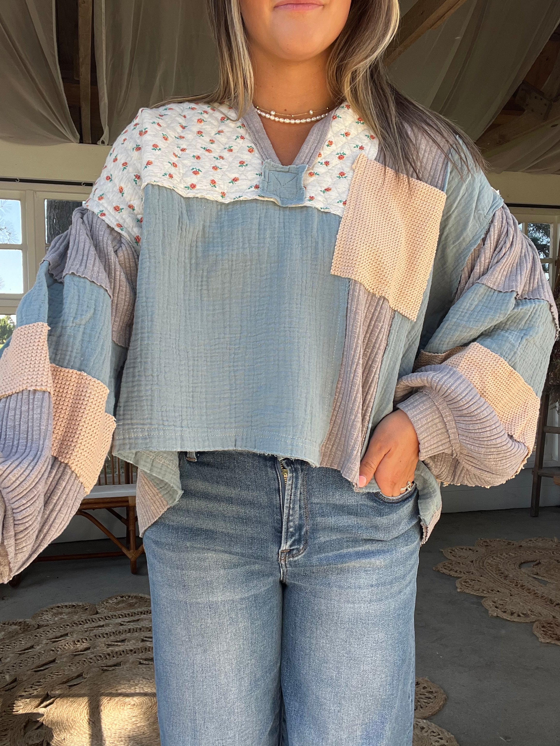 Designed in round neck balloon sleeve oversized fit top in double gauze with quilting contrast.