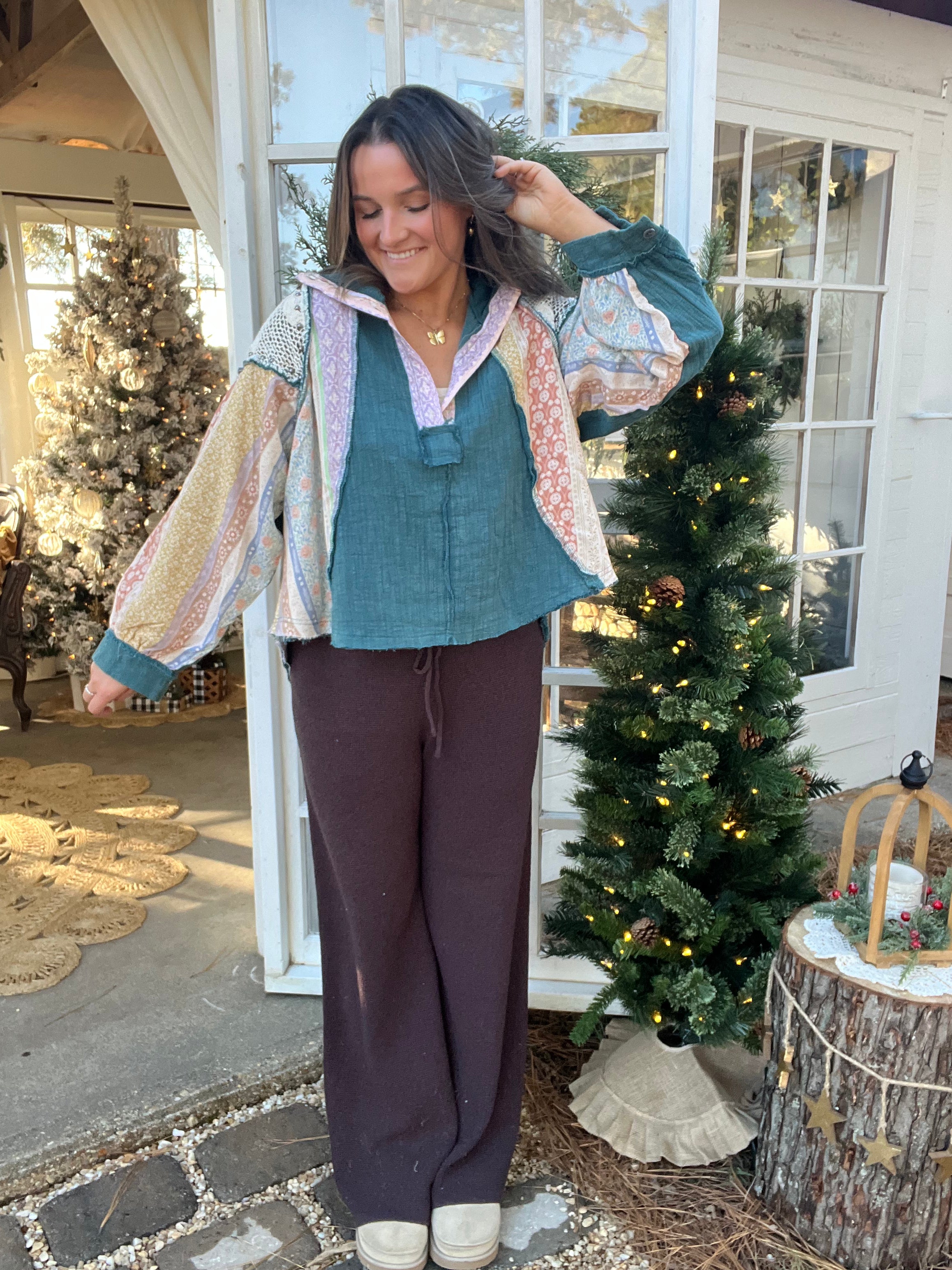 Designed in mock neck long sleeve relaxed fit top in double gauze with crochet spangle contrast.