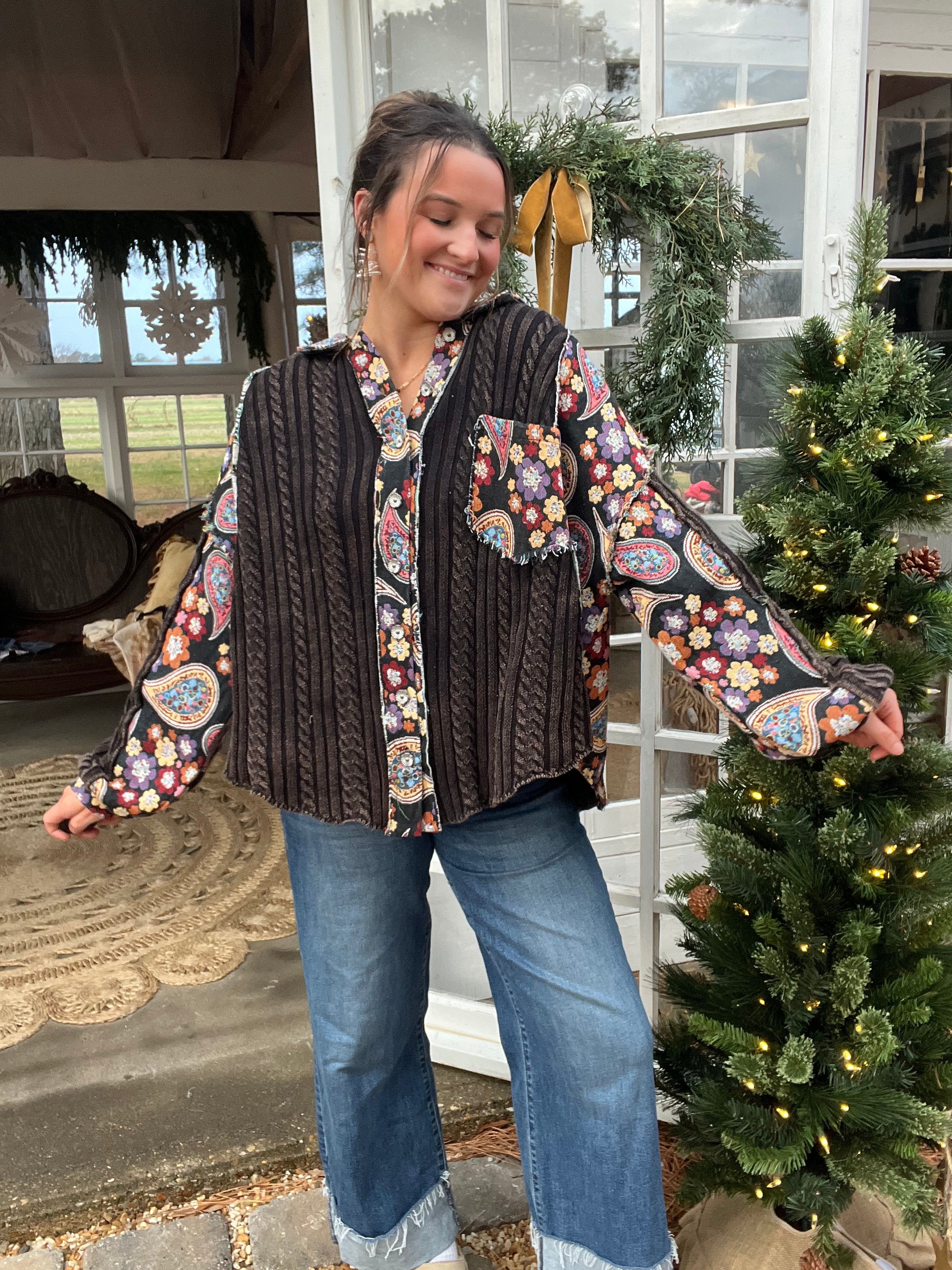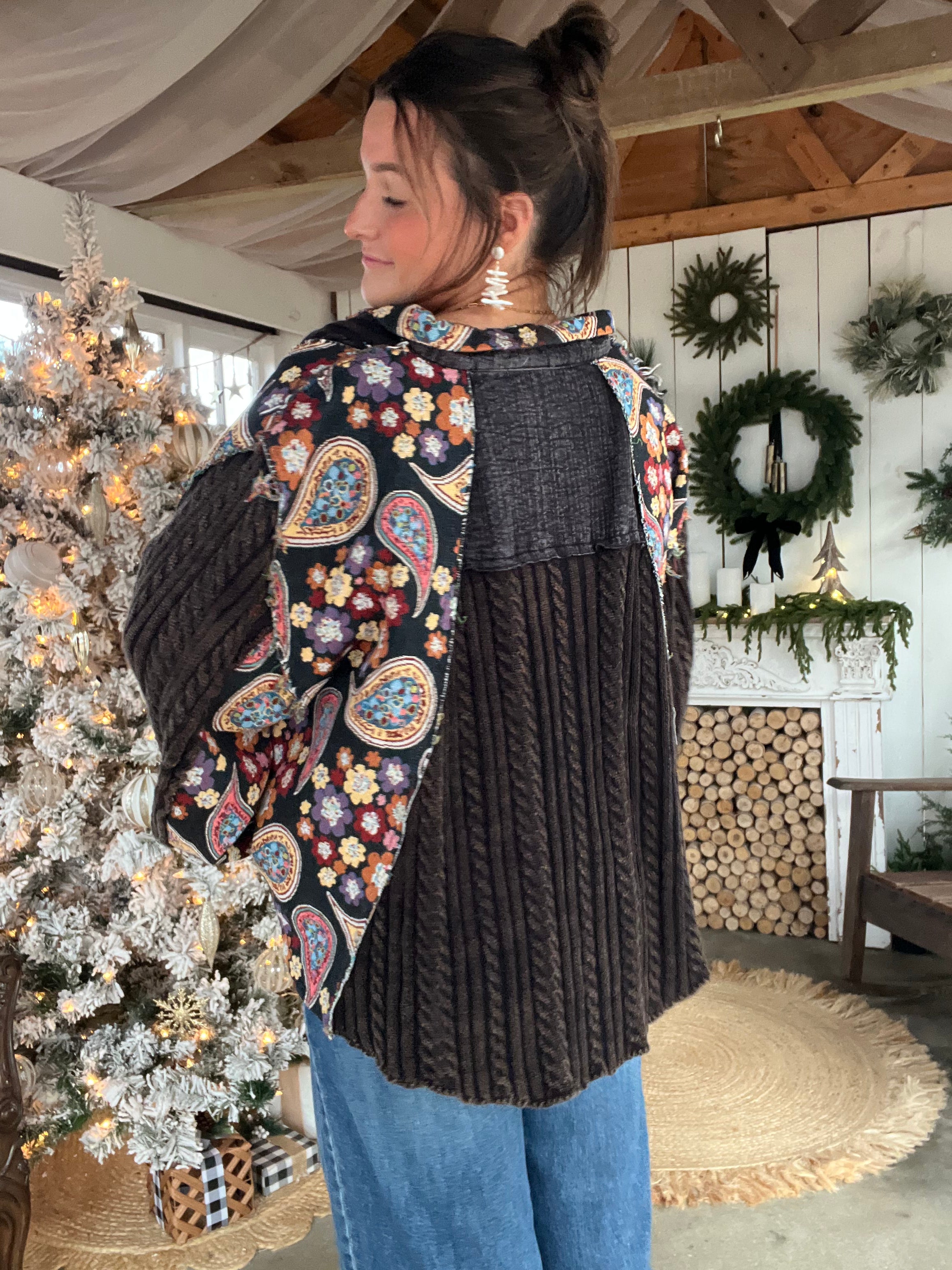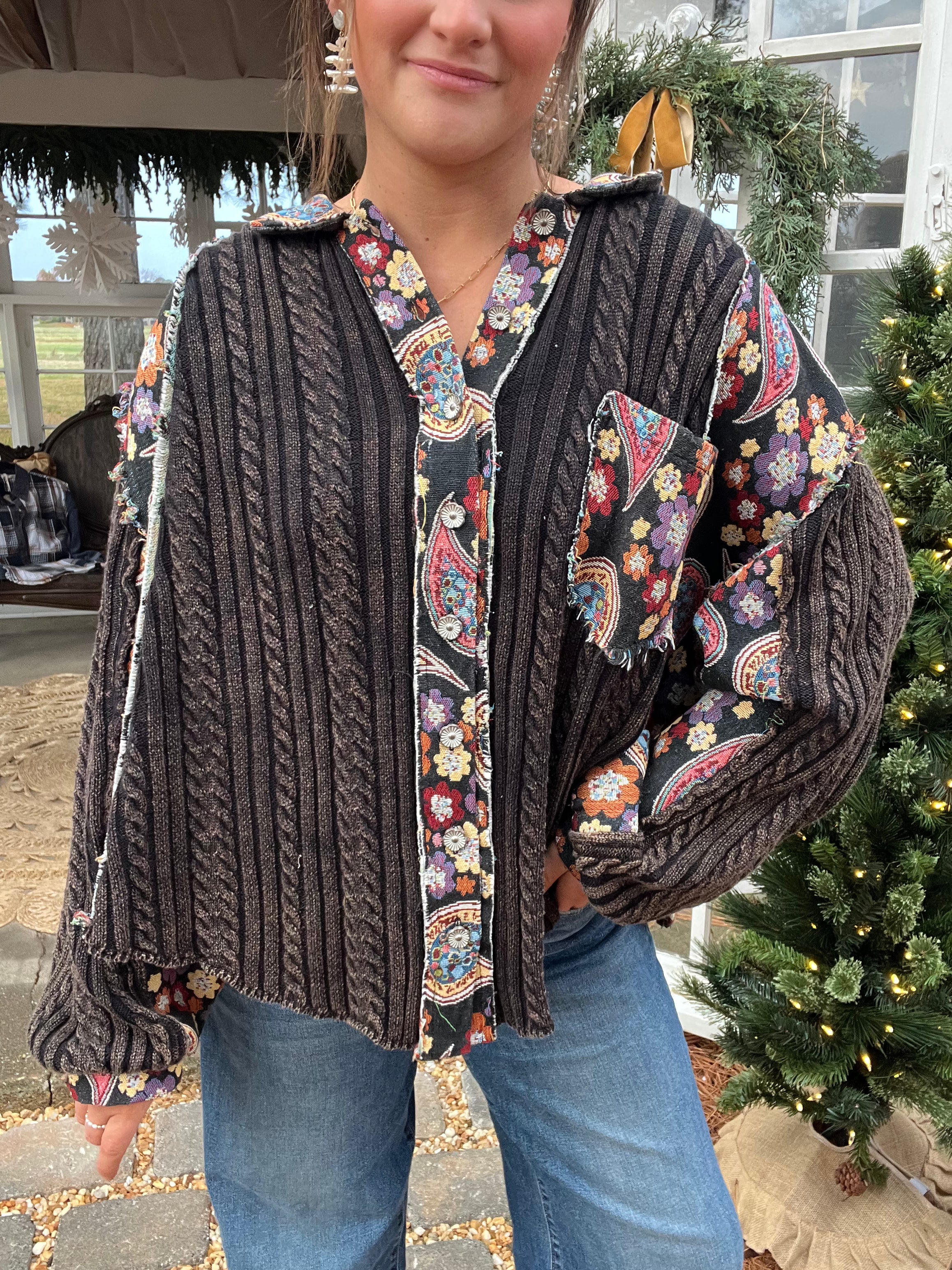 Designed in an A-line fit, this top combines sweater knit panels with jacquard fabric for a rich mix of textures and patterns. The balloon sleeves add volume and ease, while the collar neckline keeps it structured. Finished with frayed edges and paisley-inspired prints, it’s a standout layering piece for a bold, bohemian look.