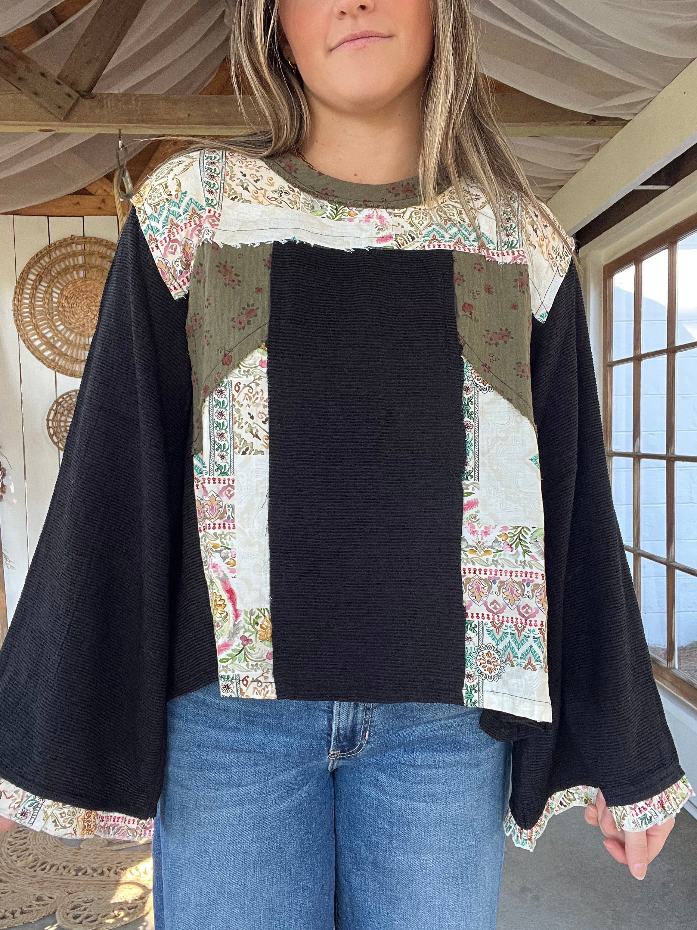 Designed in round neck long sleeve relaxed fit top in double gauze with printed woven contrast.