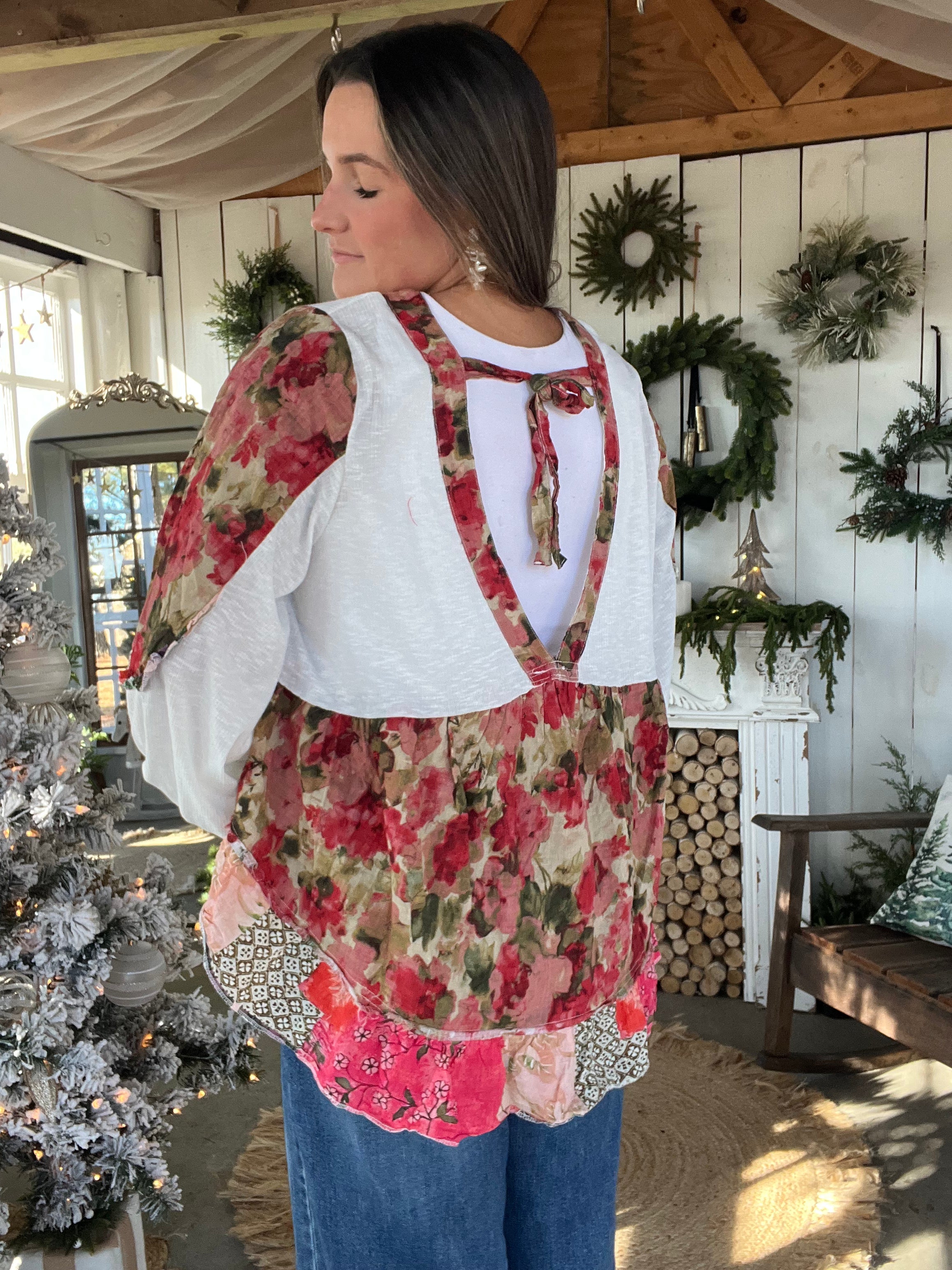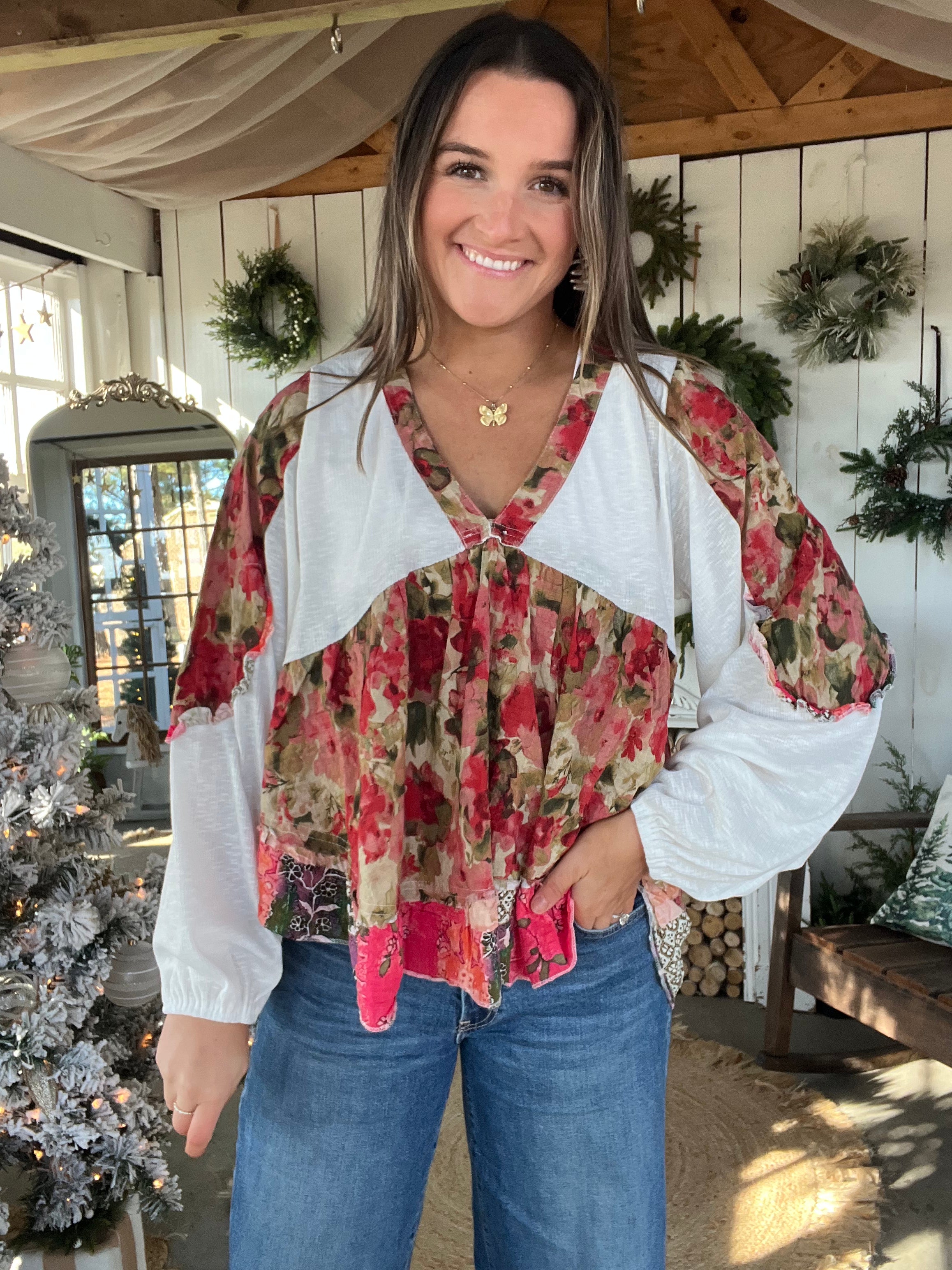 Designed in V-neck long sleeve roomy fit top in ribbed knit with varied print patchwork, shirred ruffle detailing, and elasticized cuffs.