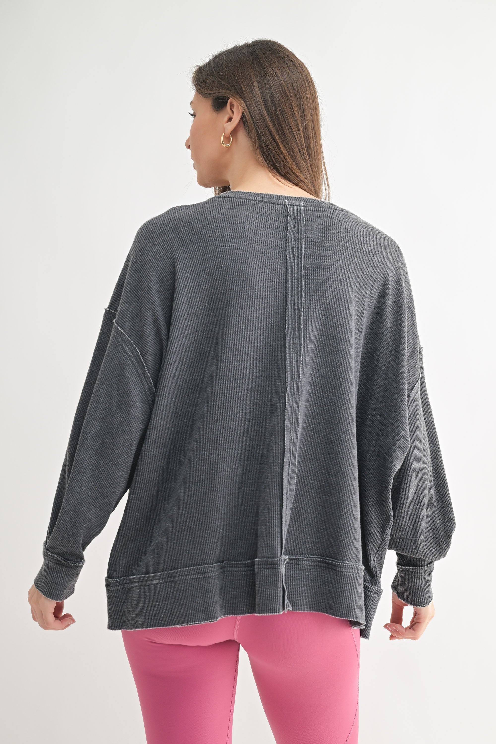 Embrace effortless style with our Oversized Waffle-Knit Distressed Long Sleeve. This piece features a unique mineral wash and raw edges at the seam lines for an edgy, worn-in look. The slits at the hem create a flowy, relaxed fit, while inverted pleats at the sleeve cuffs add fullness, giving the sleeves a subtle yet stylish volume. Perfect for layering or wearing on its own, this top is a go-to for those who love a blend of comfort and fashion-forward design.