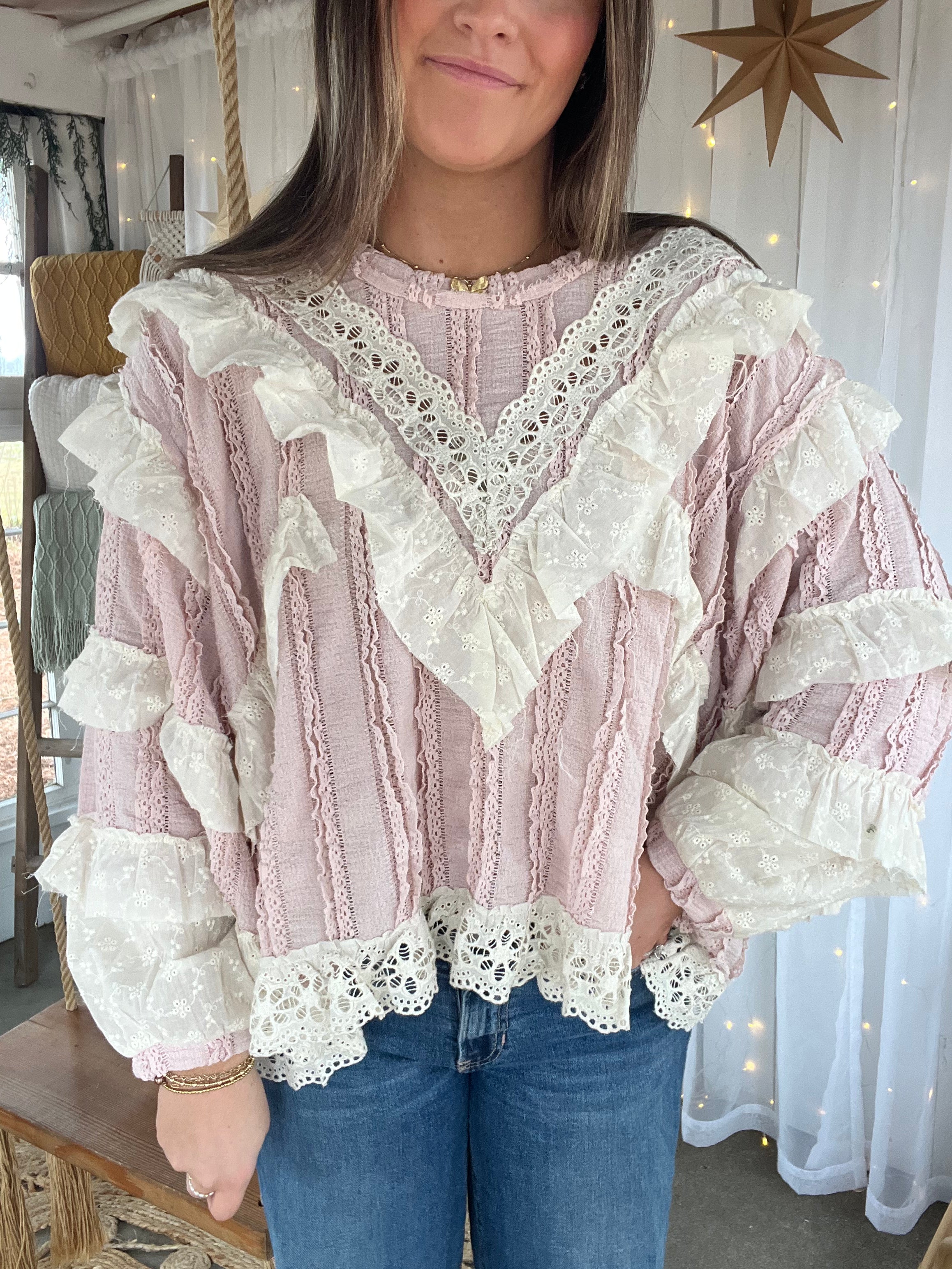 Designed in round neck balloon sleeve relaxed fit top in lace with eyelet ruffle, raw edge, trim through, trim opening ruffle detail, normal washing, solid color.