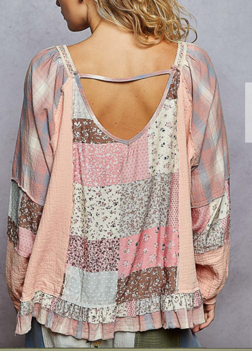 Designed in square neck, balloon sleeve, oversized fit top in double gauze with plaid contrast.