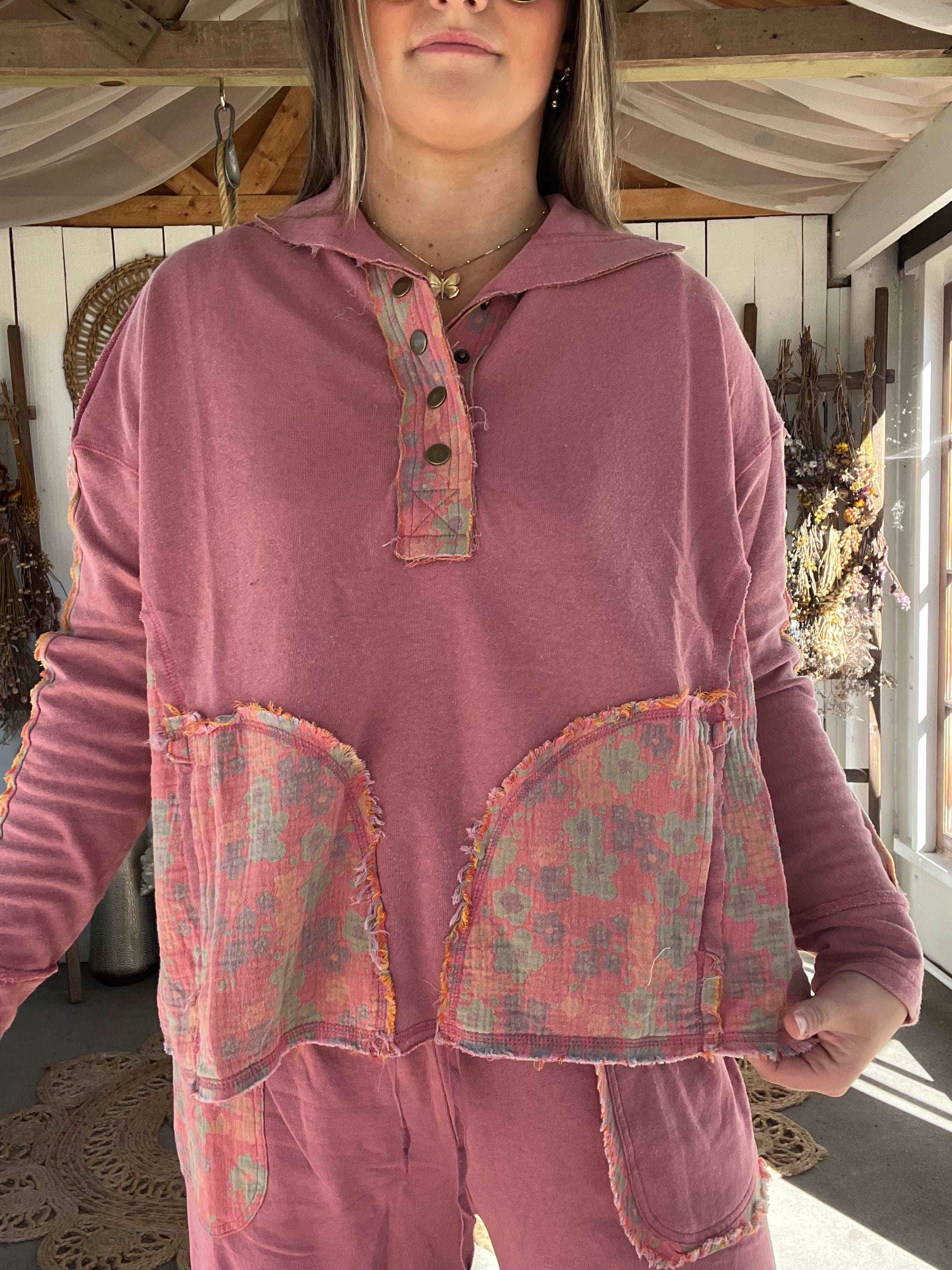 FLORAL PRINT MOCK NECK WASHED TERRY PULLOVER