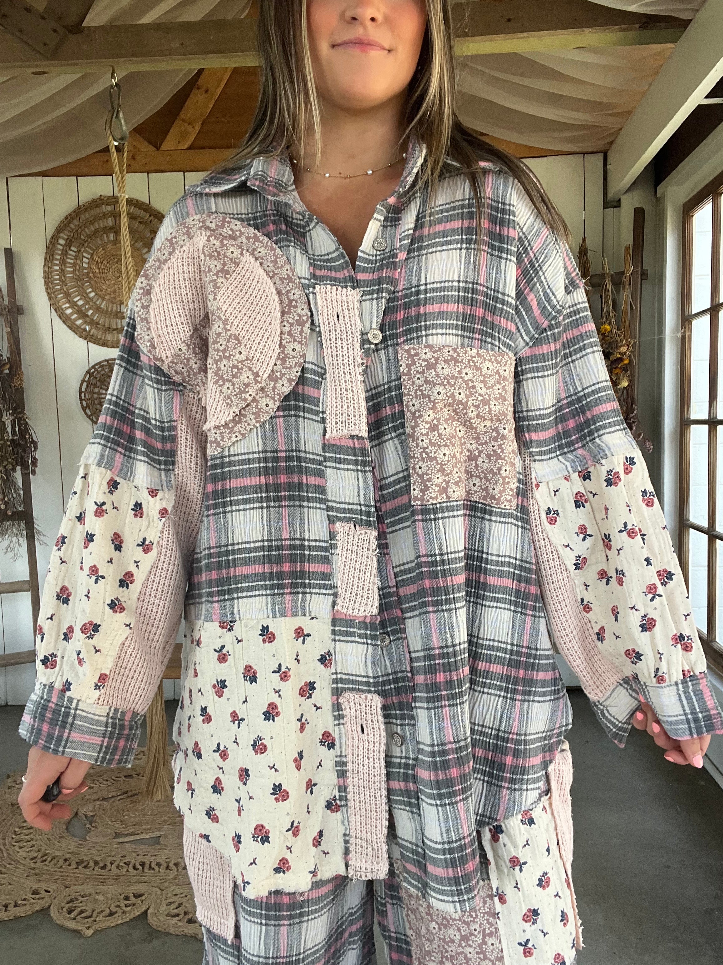 Designed in balloon sleeve roomy fit shirt top in textured plaid with peace patch, cut and sew sweater knit patch, vintage washing.