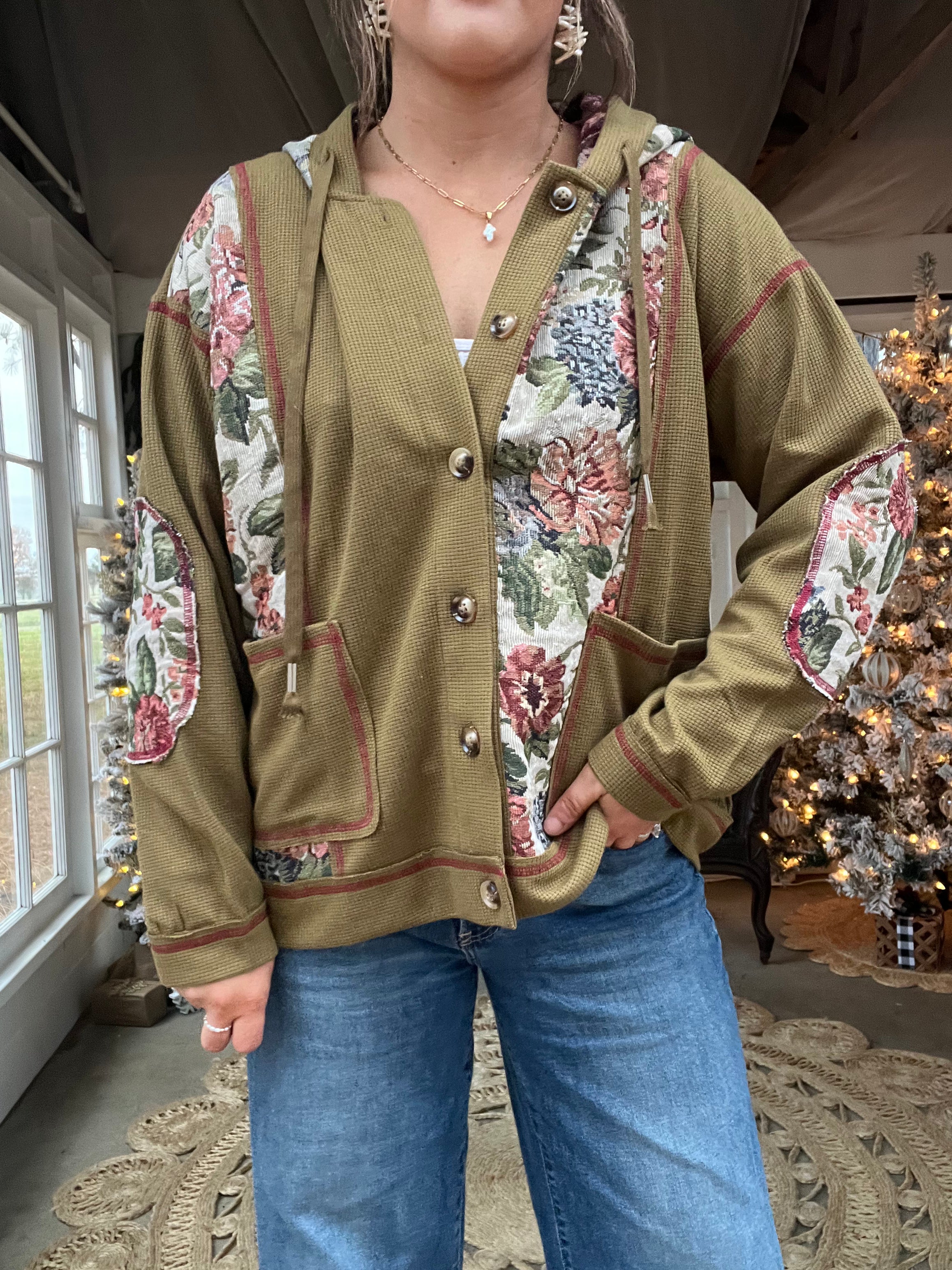 Women's vintage teddy bear design knit button down hooded light wear jacket. Designed with a waffle knit contrast fabric. Raw edge cut and reverse stitching. Hoodie with drawstrings.