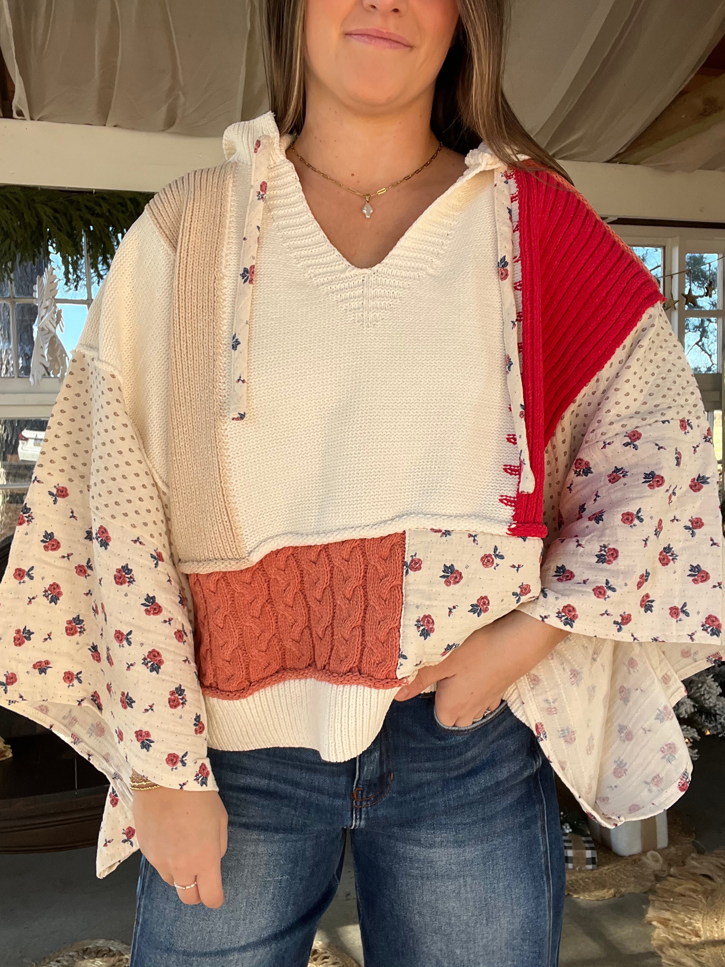 Designed in V-neck cardigan, oversized fit top in chenille sweater and gauze mix with rolling edge detail pointed floral pattern.