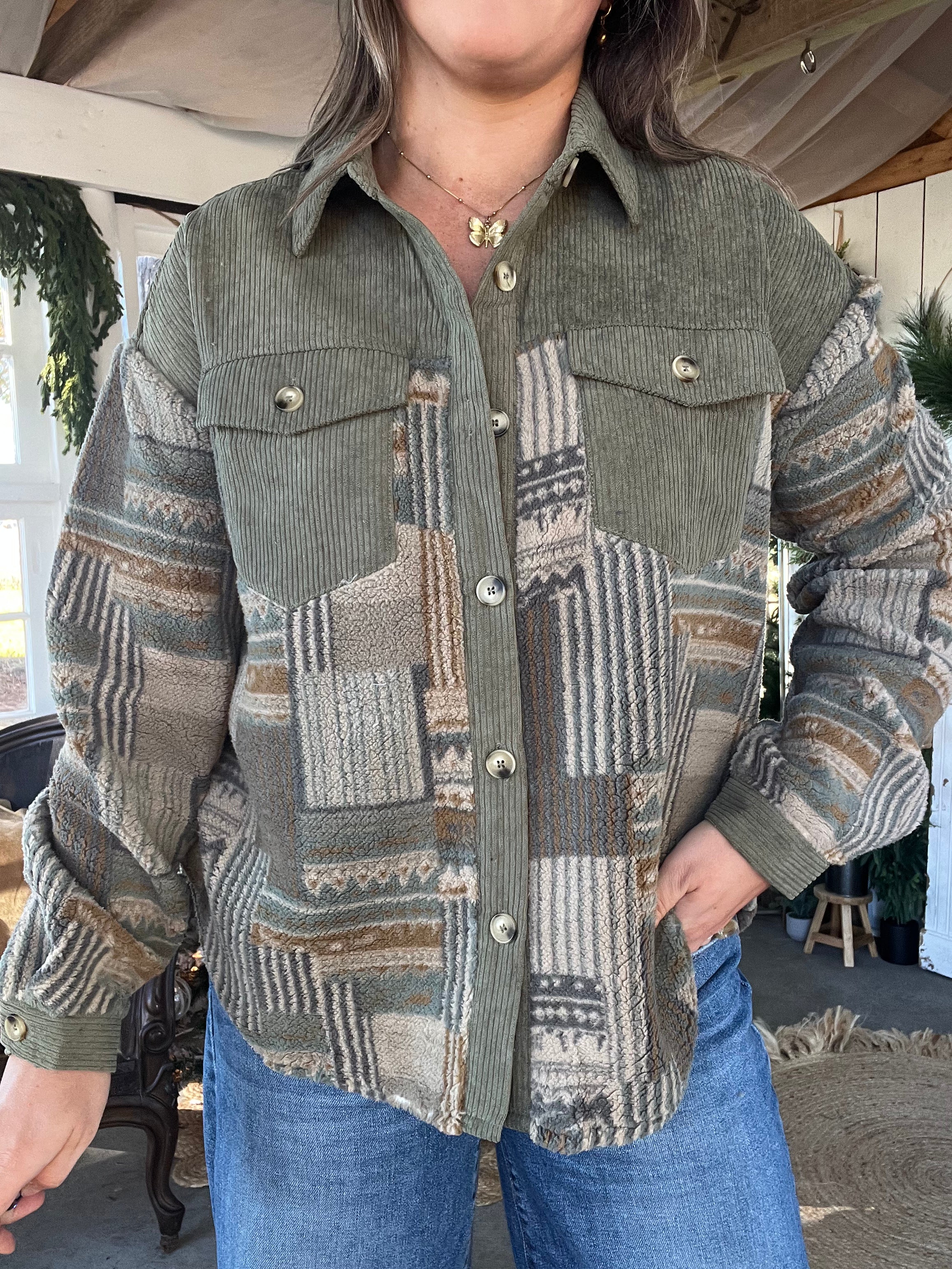 PATTERNED FLEECE CORDUROY CONTRAST BUTTON DOWN SHIRT JACKET SHACKET