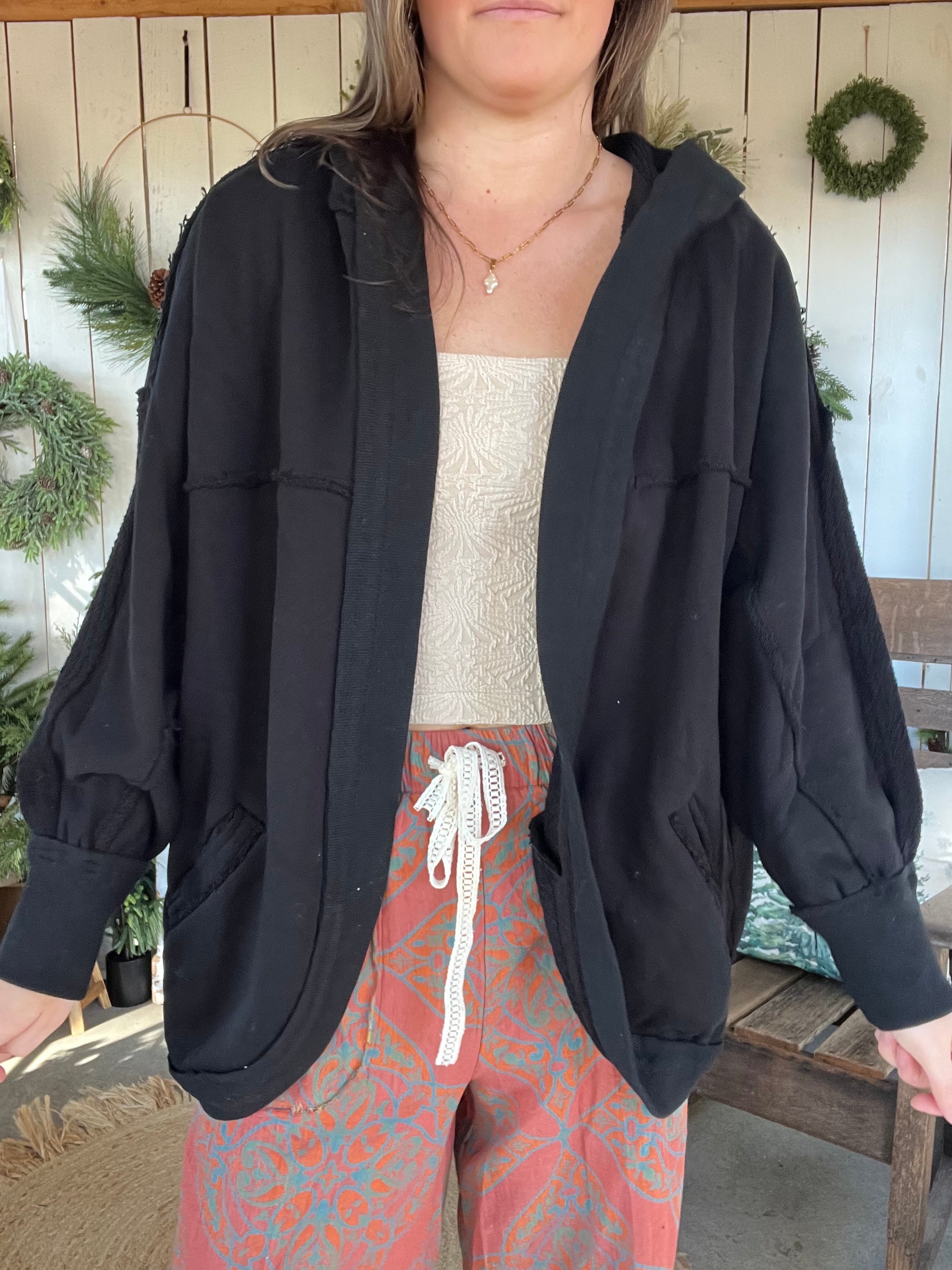 Janely Hooded Cardi is crafted in soft cotton with an oversized fit. It features an exaggerated hood and drop-shoulder sleeves, offering both style and comfort.