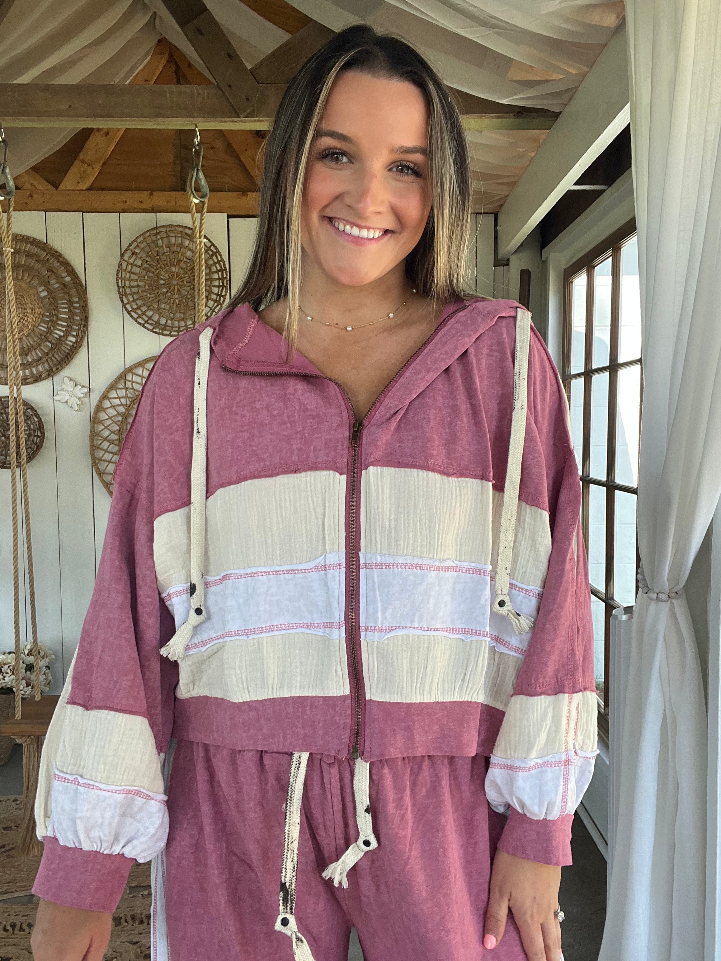 Designed in balloon sleeve relaxed fit hoodie zip up top in cotton with double gauze patch, painted hood loop point, outseam and overlock top stitch detail, vintage washing, solid color.