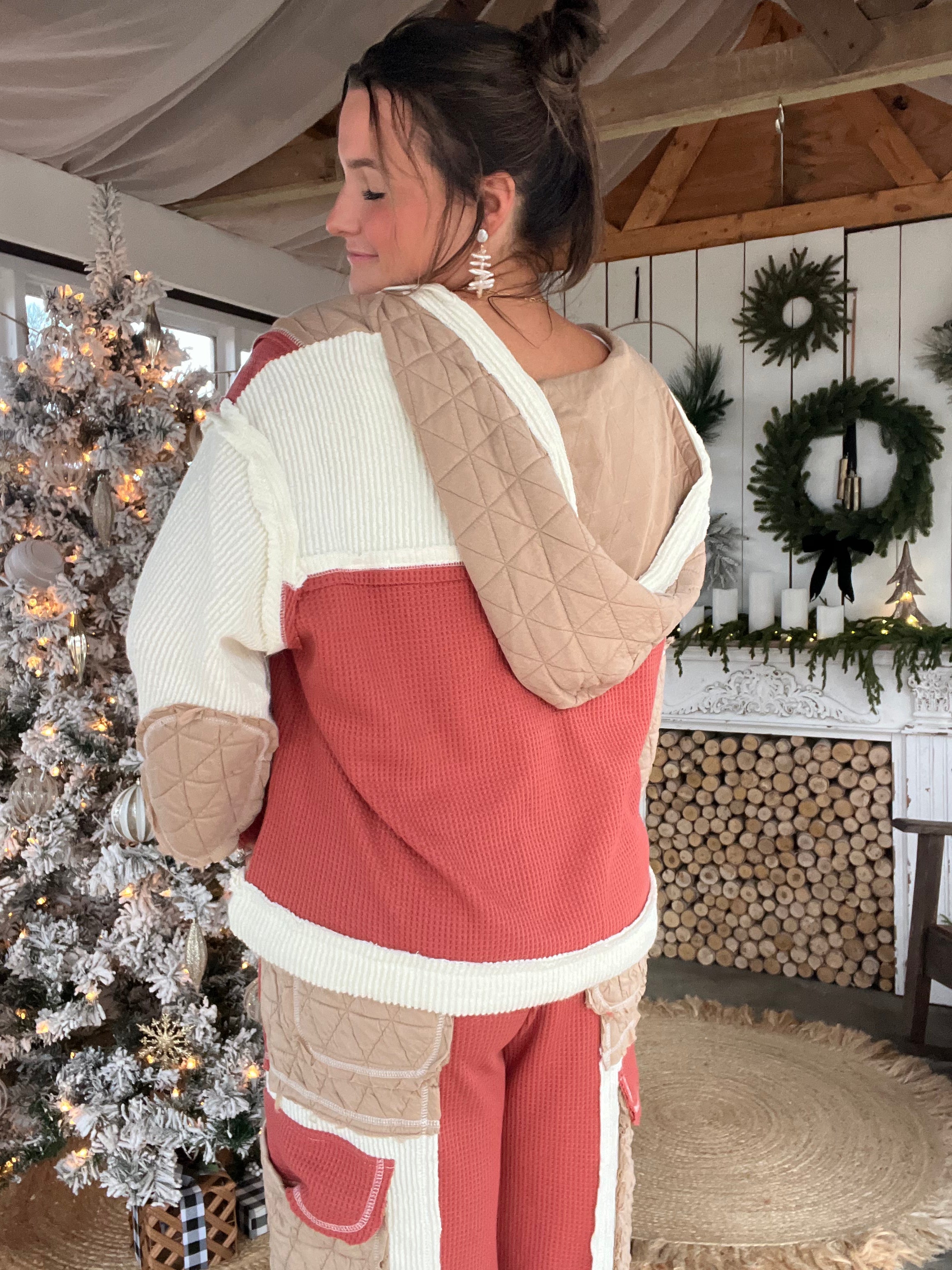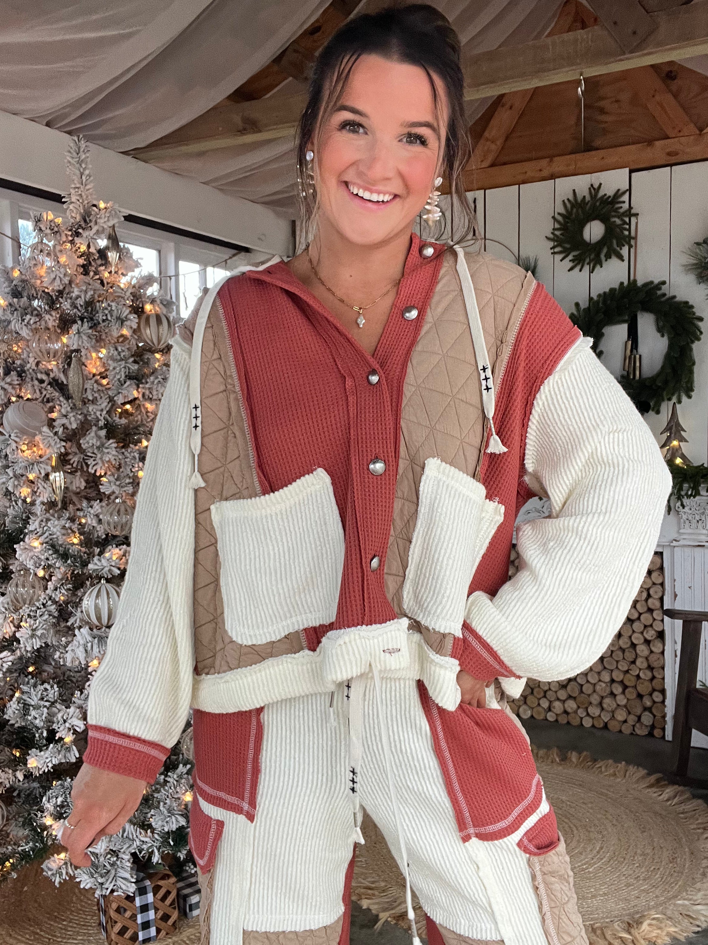 Designed in button-down oversized fit jacket with hoodie featured in thermal, quilted knit, and cut and sew sweater knit.
