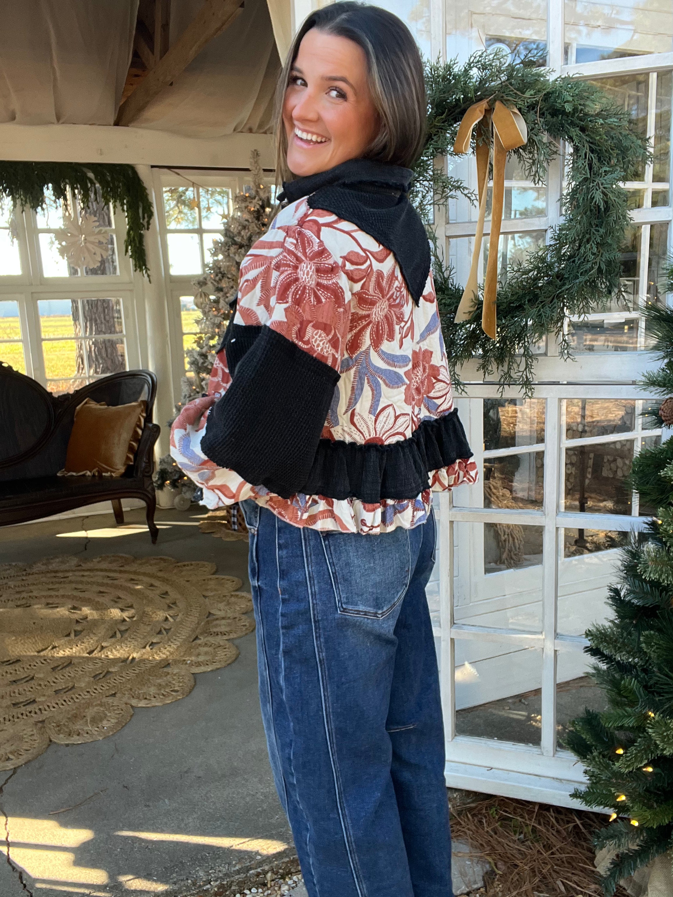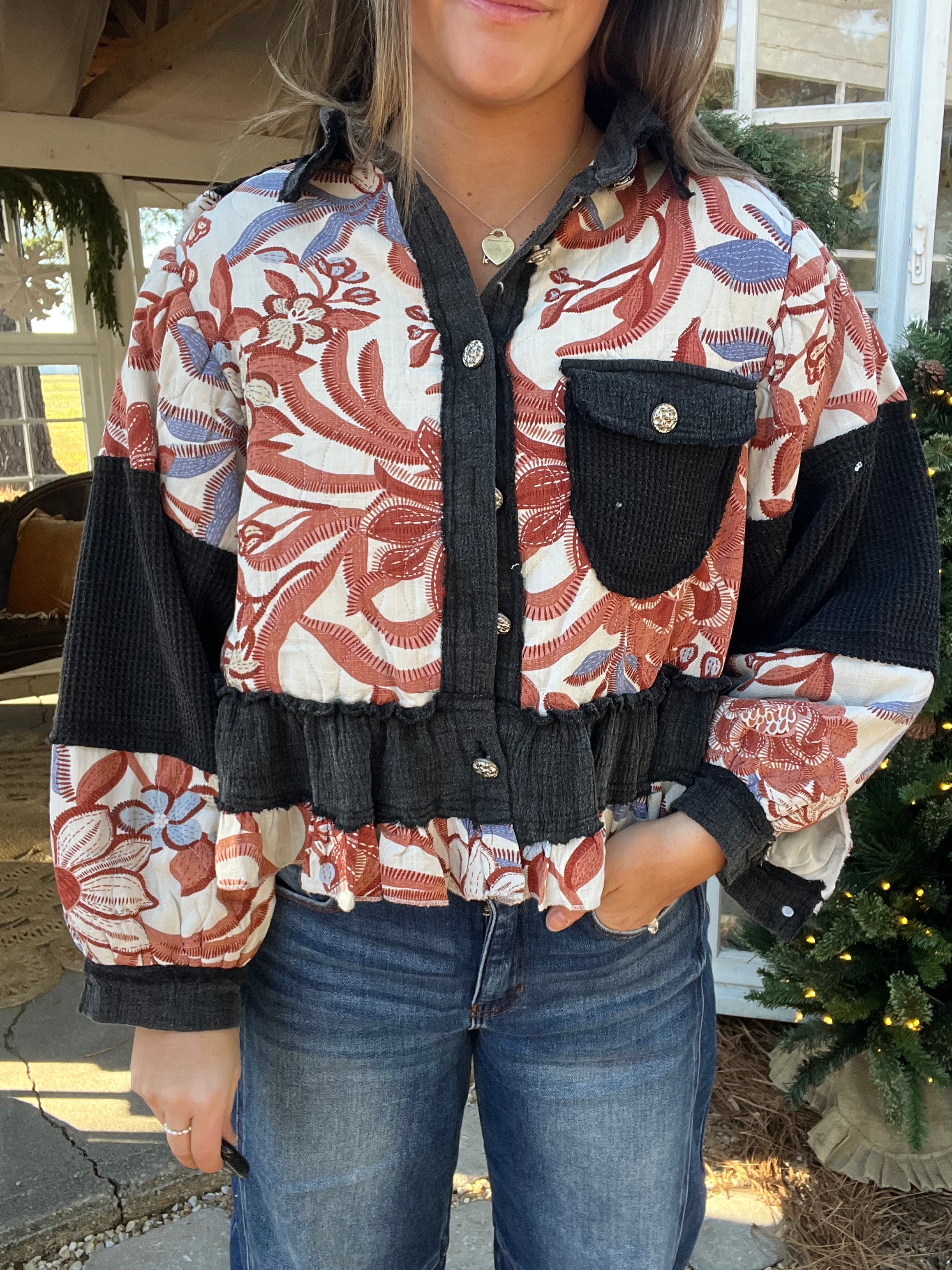 Designed in jacket, balloon sleeve, A-line fit top in quilted fabric with raw edge detail pointed floral pattern.