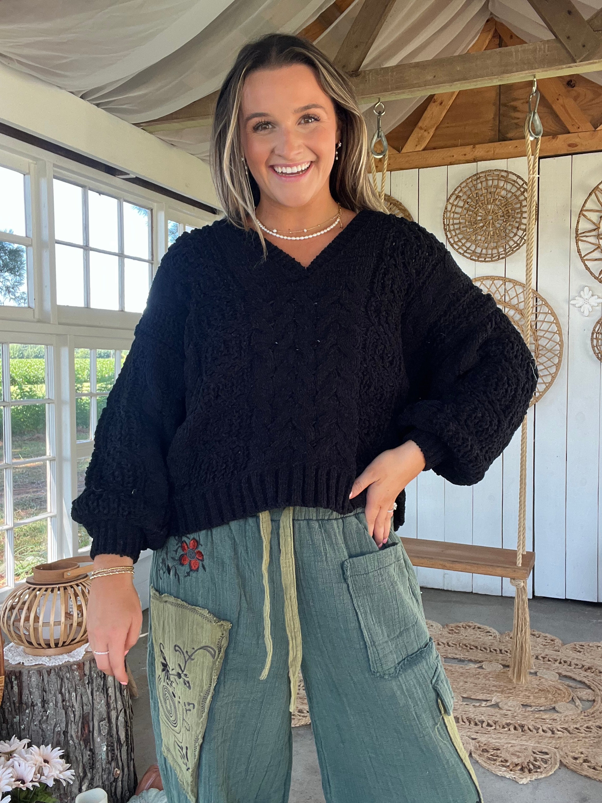 Designed overlay V-neck, balloon sleeve, semi cropped fit top in chenille sweater with twisted knitting detail pointed solid pattern.