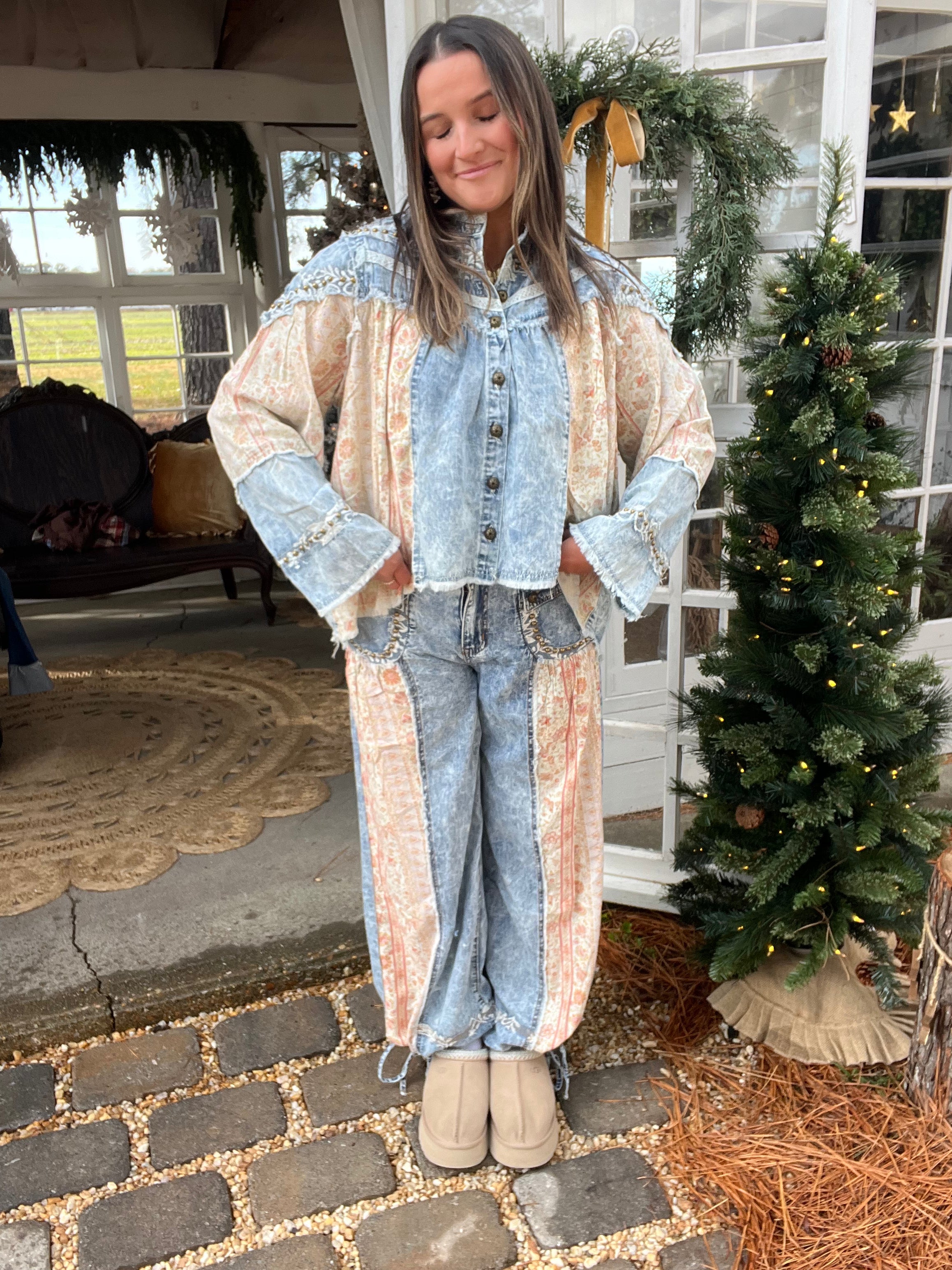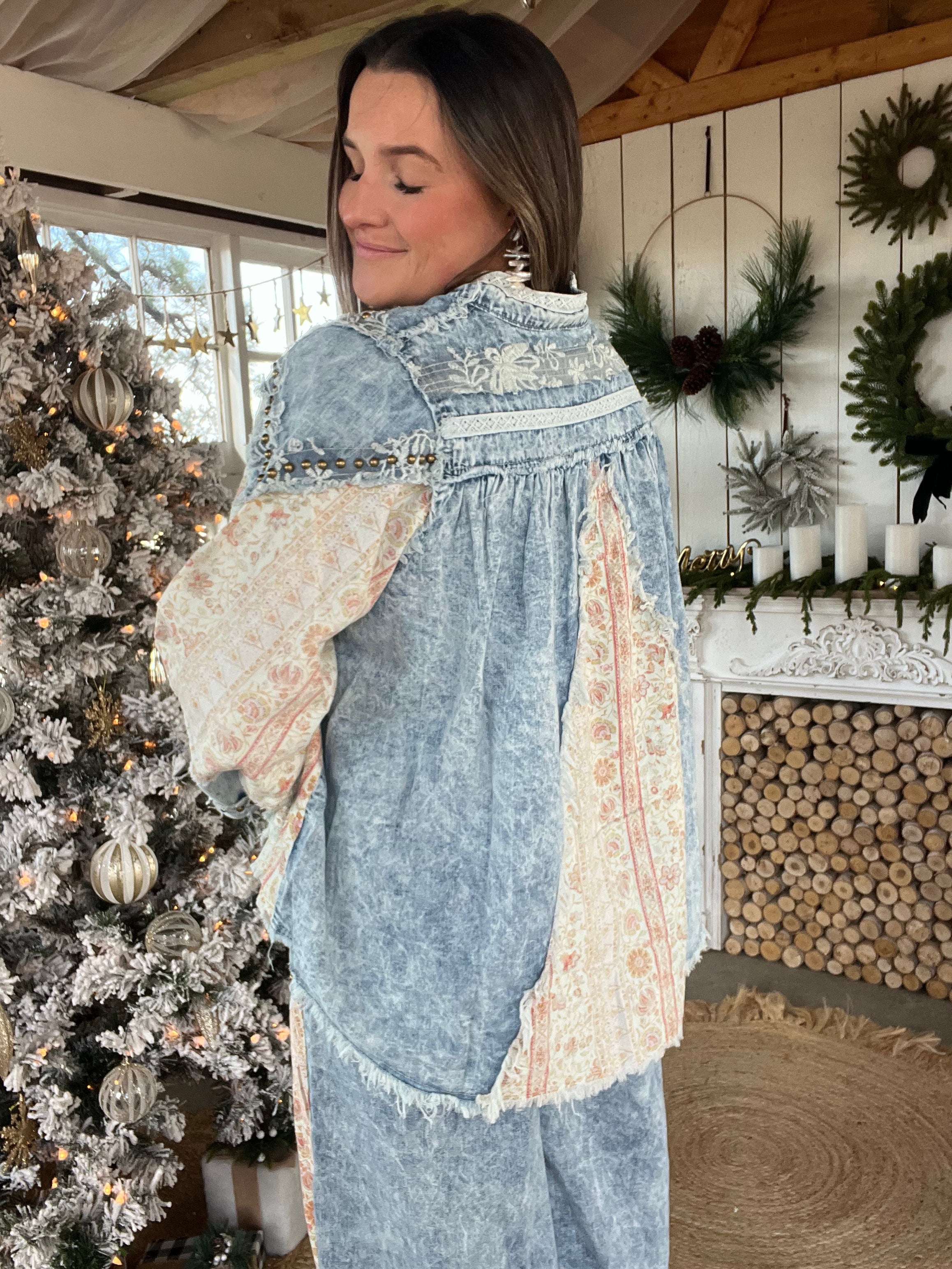 Stay effortlessly stylish and comfortable with this unique top, designed in a high neck silhouette featuring slightly balloon sleeves and a relaxed fit for easy movement. This style is blended with cozy thermal or classic denim panels and boasts a striking printed contrast that adds visual interest, complemented by subtle stud details for an edgy finish. Perfect for layering or wearing on its own, this versatile piece brings a modern twist to your everyday outfit.