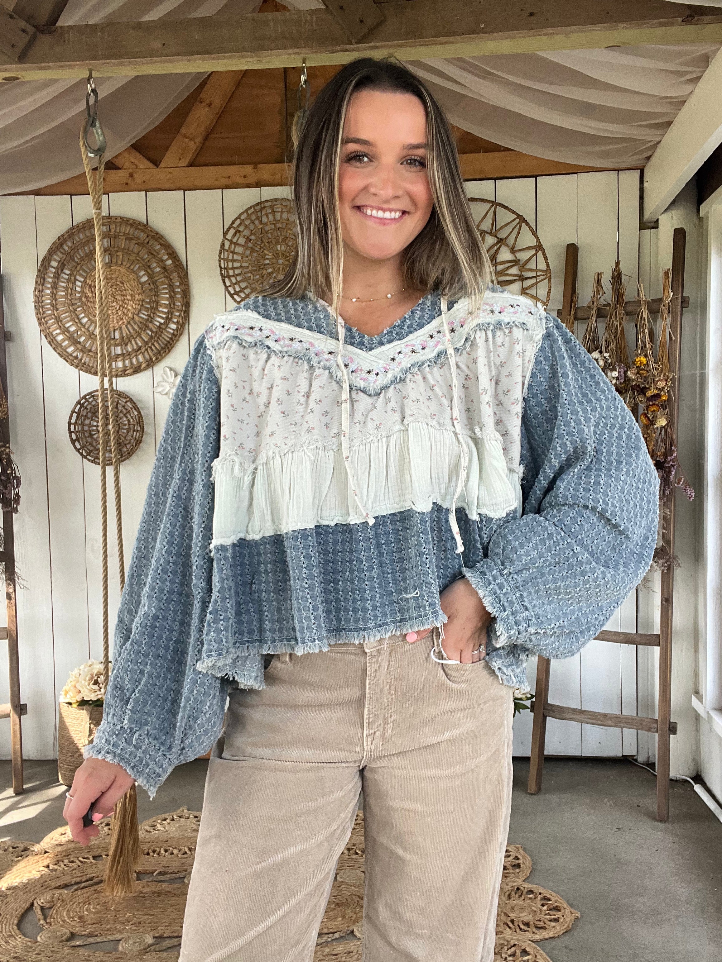 Designed in V-neck balloon sleeve regular fit hoodie top in textured denim with twill patch, double gauze ruffle and shirring, embroidery detail, outseam, raw edge, vintage washing, solid color.