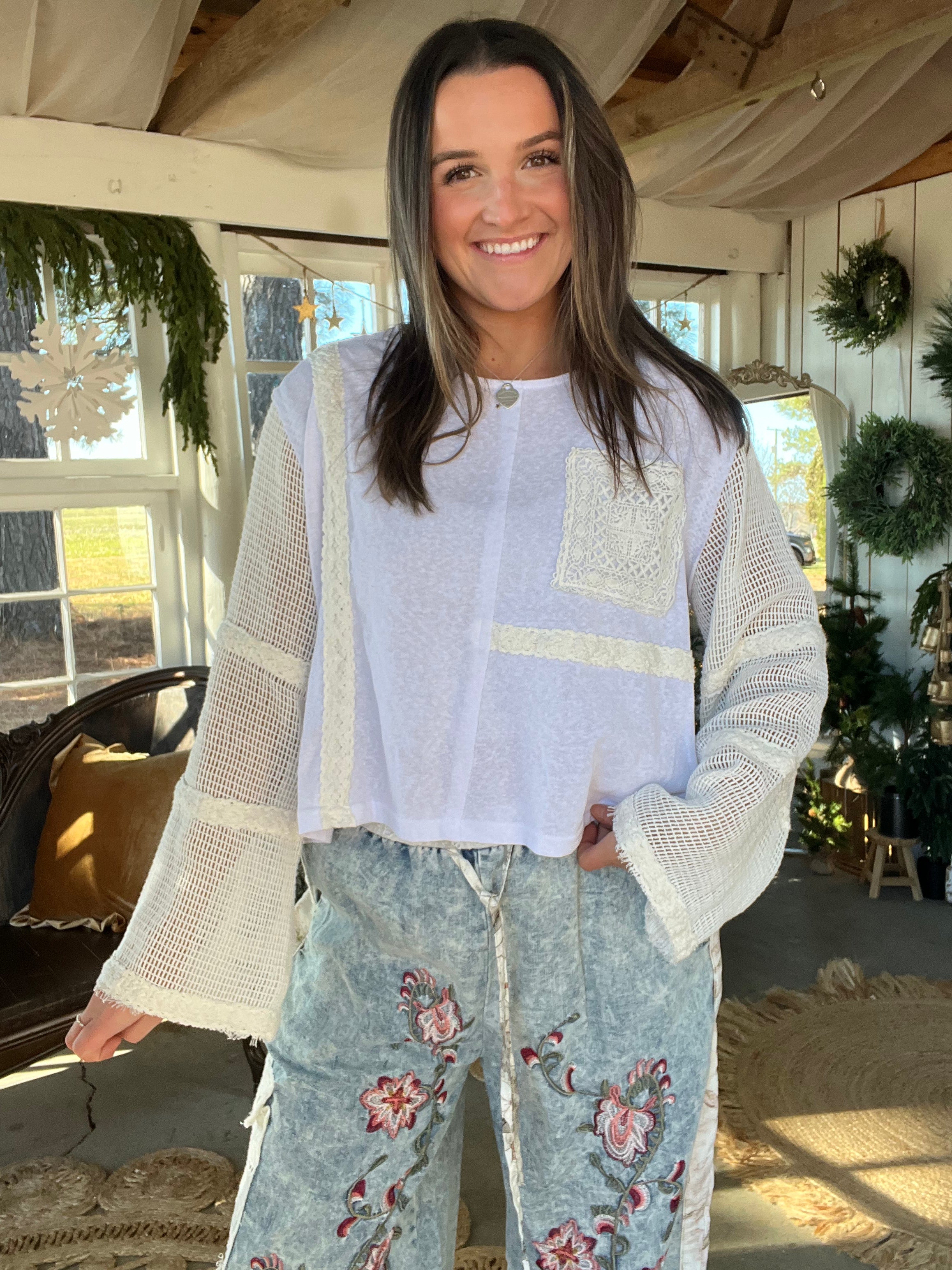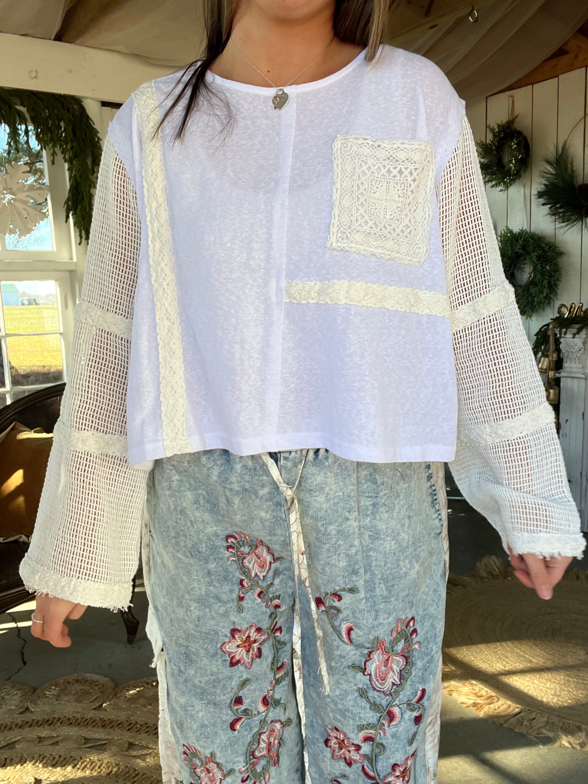 Designed in round neck long sleeve relaxed fit top in cotton with crochet see through sleeve, trim point, crochet patch pocket, outseam, normal washing, solid color.