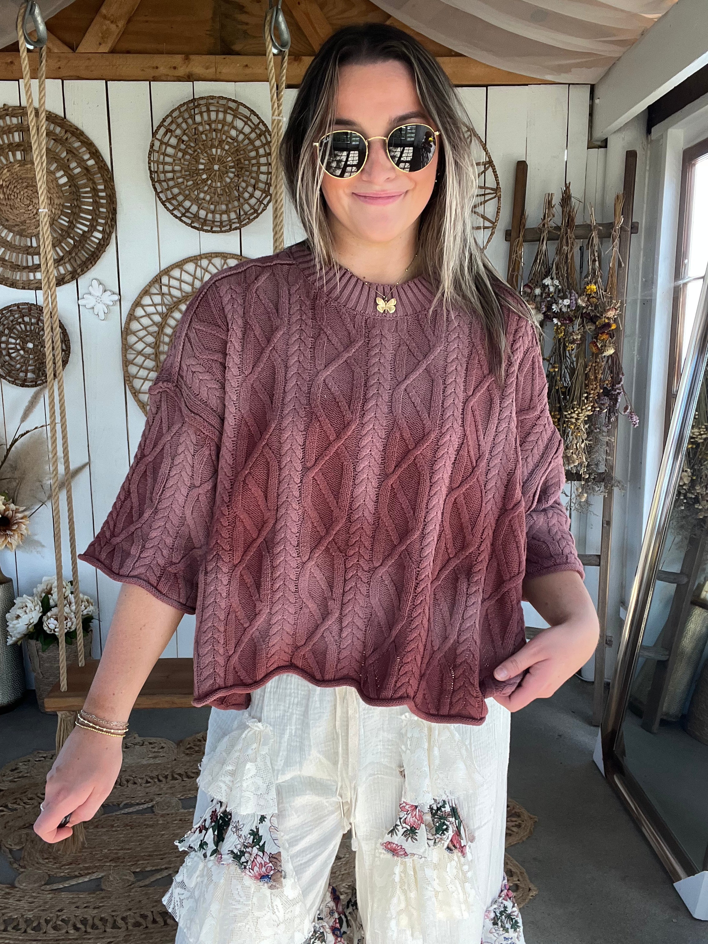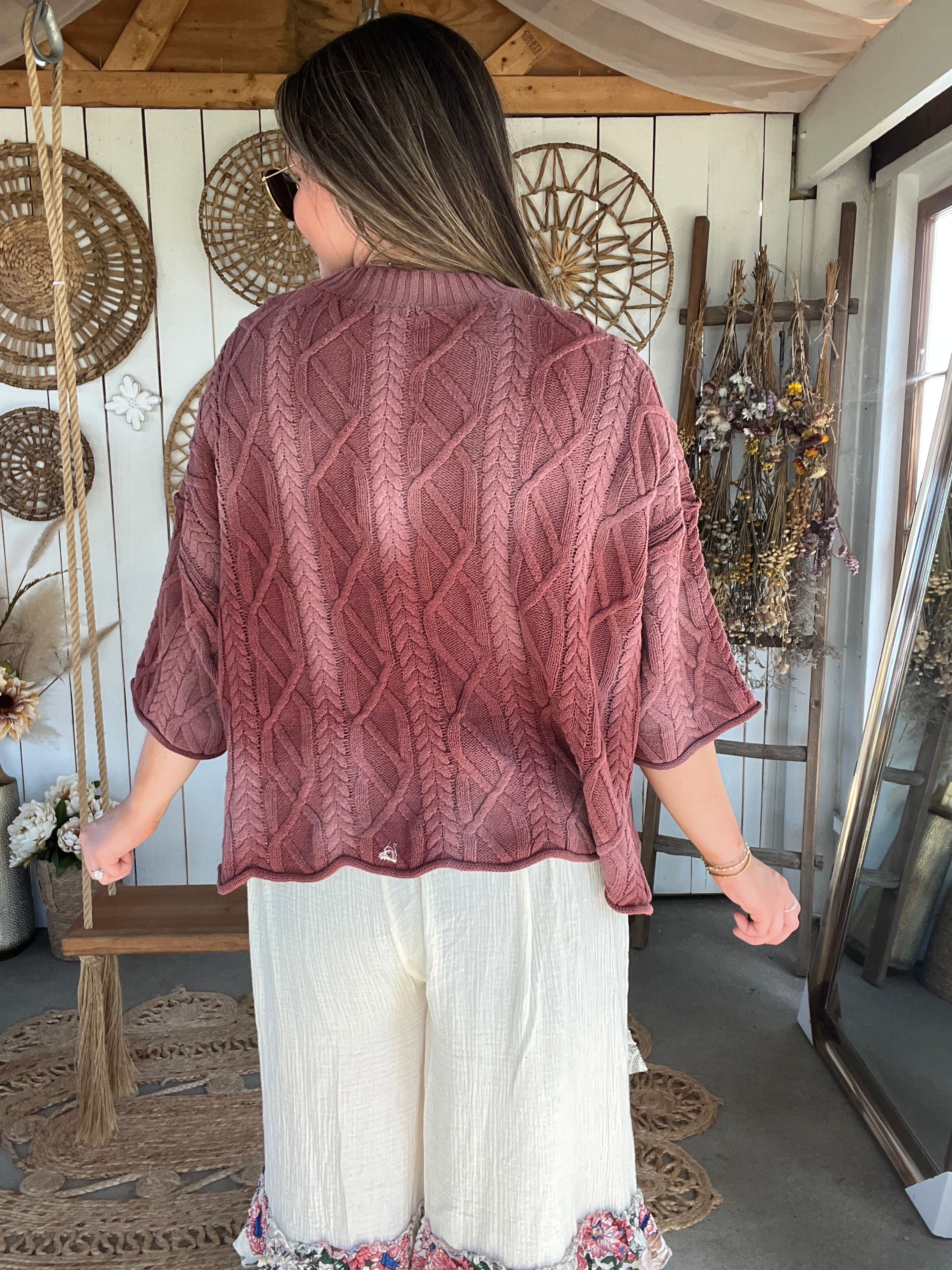 Oversized Washed Cable Sweater. Designed with a relaxed, slouchy fit, this piece features a rich cable knit texture, dropped shoulders. The washed finish gives it a soft, lived-in feel that is perfect for everyday wear. -Slouchy, oversized silhouette for a laid-back look -Intricate cable knit detailing -Soft, washed fabric for all-day comfort -Dropped shoulders -wide sleeves for effortless layering