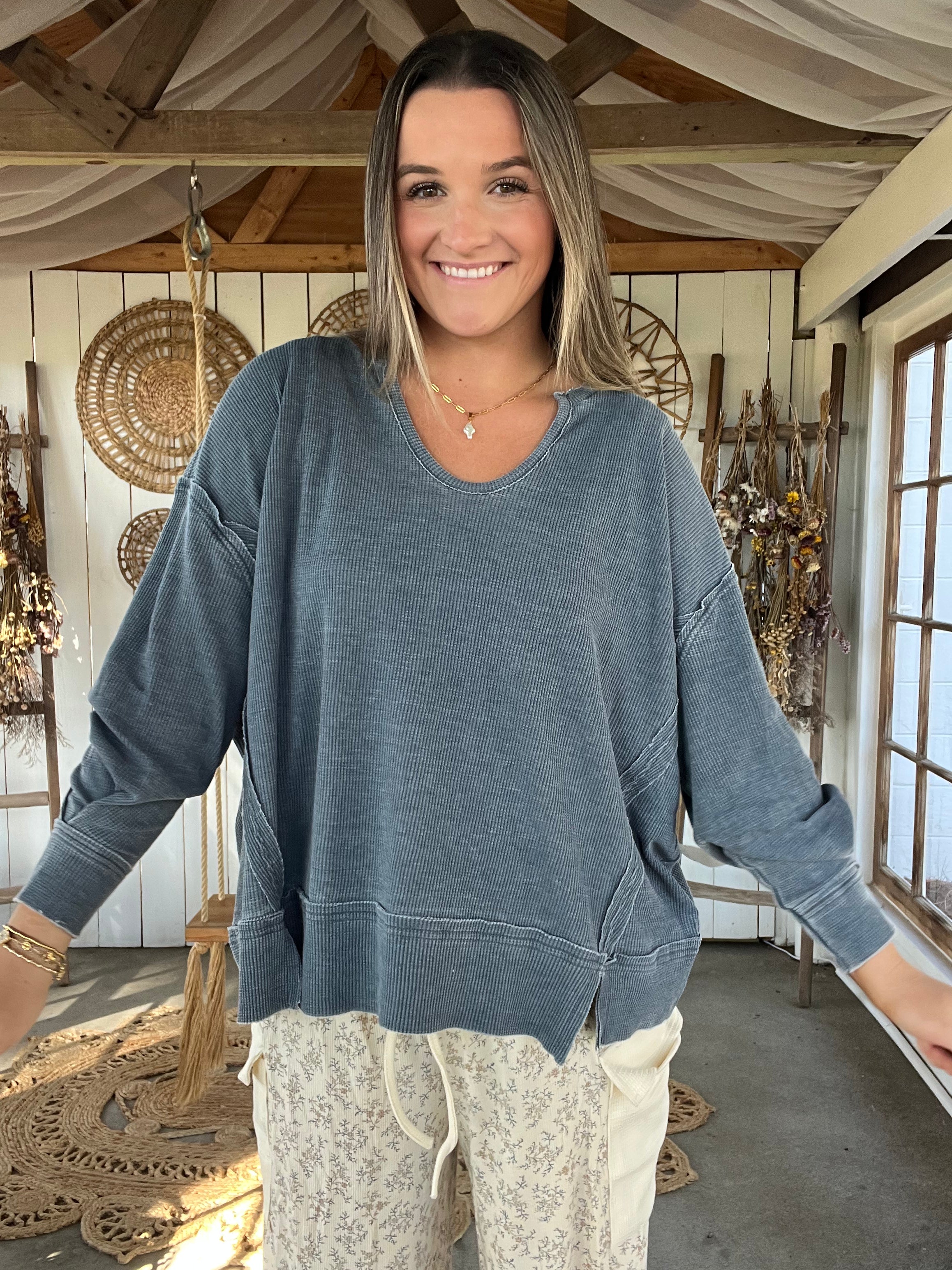 Embrace effortless style with our Oversized Waffle-Knit Distressed Long Sleeve. This piece features a unique mineral wash and raw edges at the seam lines for an edgy, worn-in look. The slits at the hem create a flowy, relaxed fit, while inverted pleats at the sleeve cuffs add fullness, giving the sleeves a subtle yet stylish volume. Perfect for layering or wearing on its own, this top is a go-to for those who love a blend of comfort and fashion-forward design.
